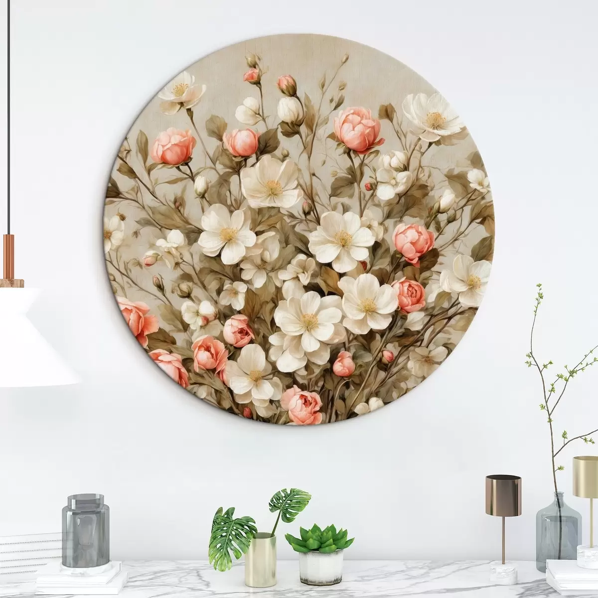 Кругла картина Квіти у прозорій вазі на бежевому тлі Nr r42534