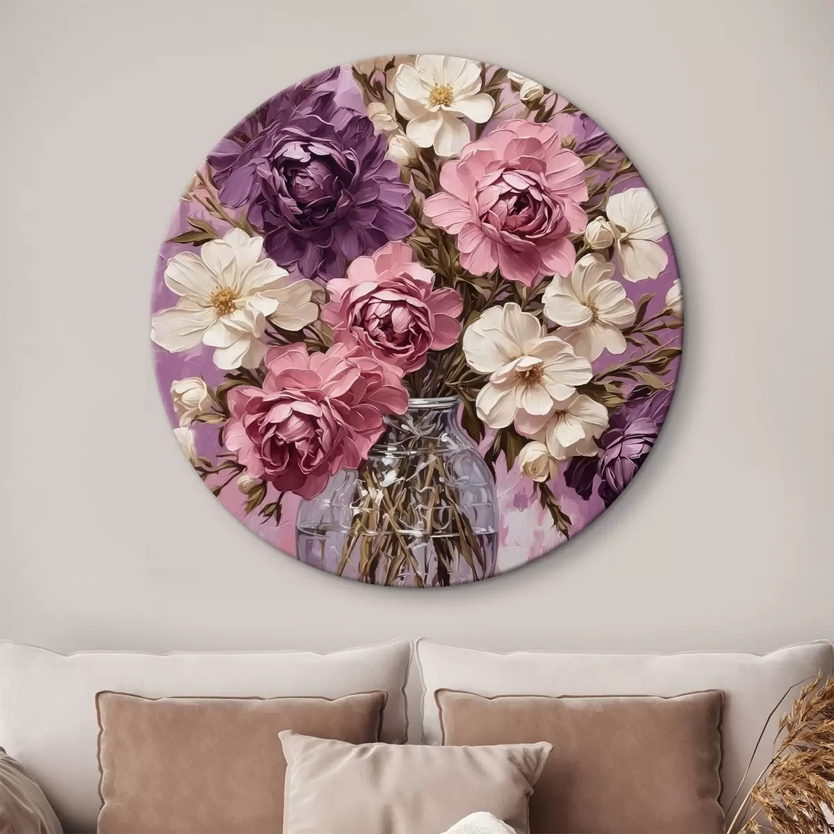 Кругла картина Квіти у прозорій вазі на фіолетовому фоні Nr r42535