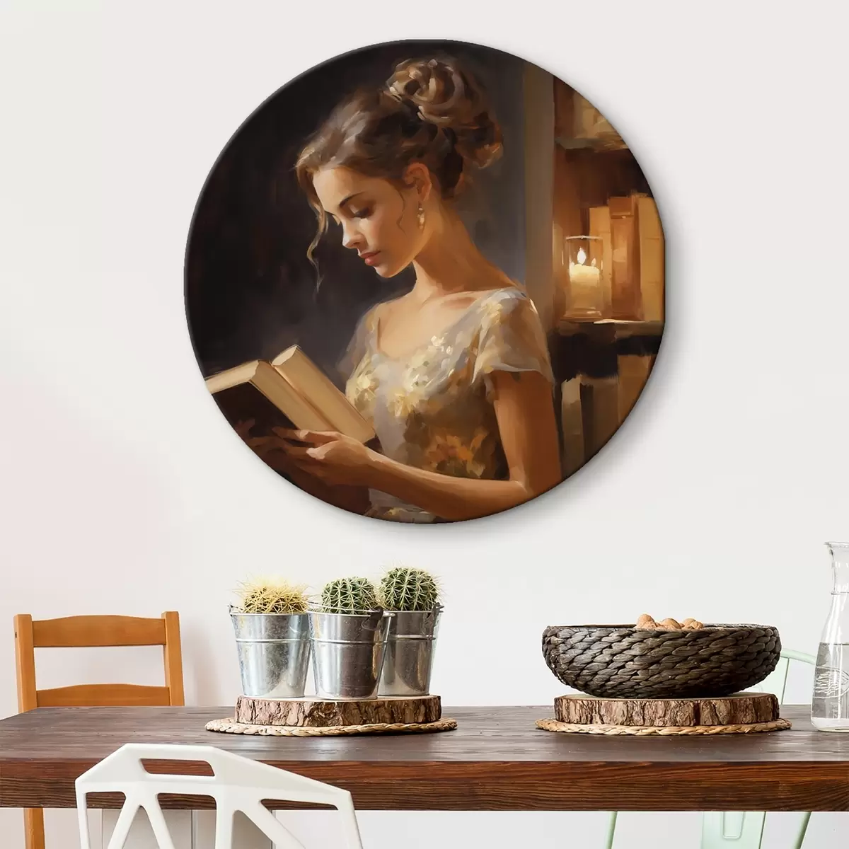 Кругла картина Молода жінка в елегантній сукні читає книгу в атмосферному освітленні, в оточенні книжкових полиць і м'якого сяйва свічок Nr r42570