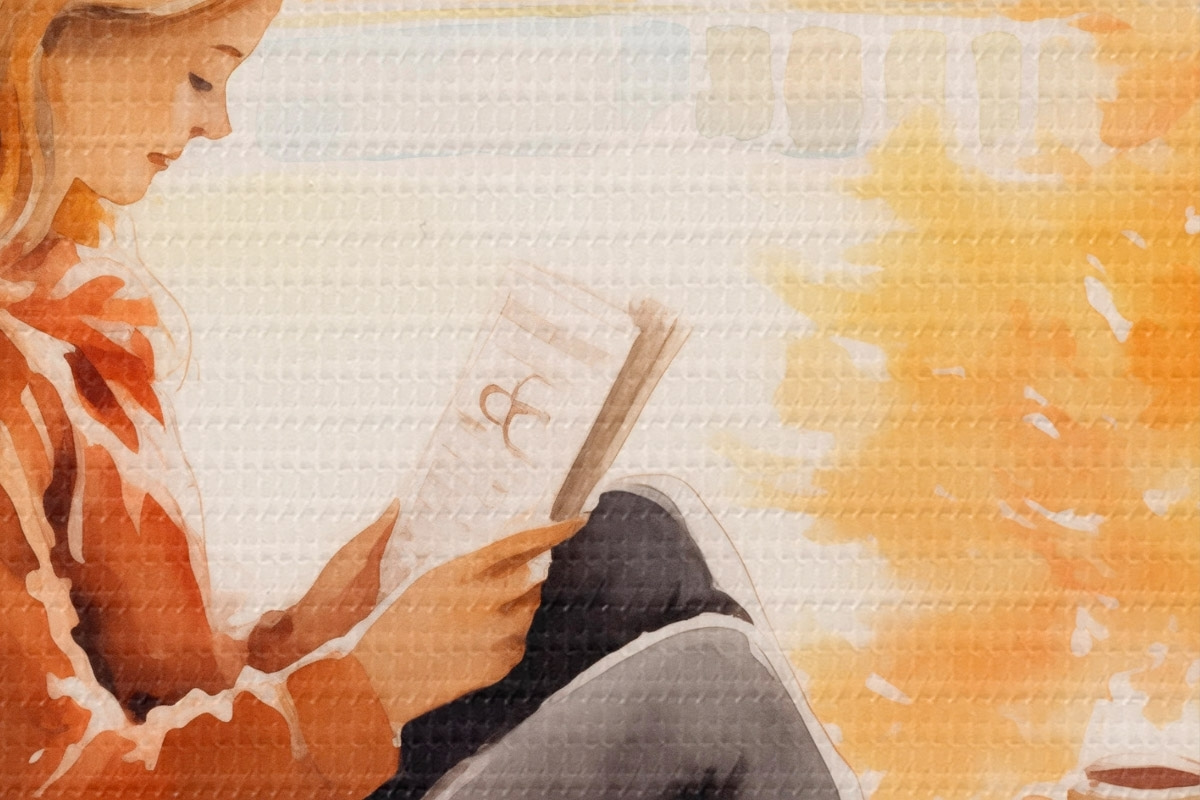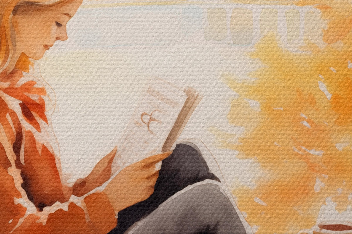 Кругла картина Дівчина читає книгу біля відчиненого вікна в осінньому пейзажі, на тлі яскраво-золотистих дерев і чашки чаю поруч. Nr r42572