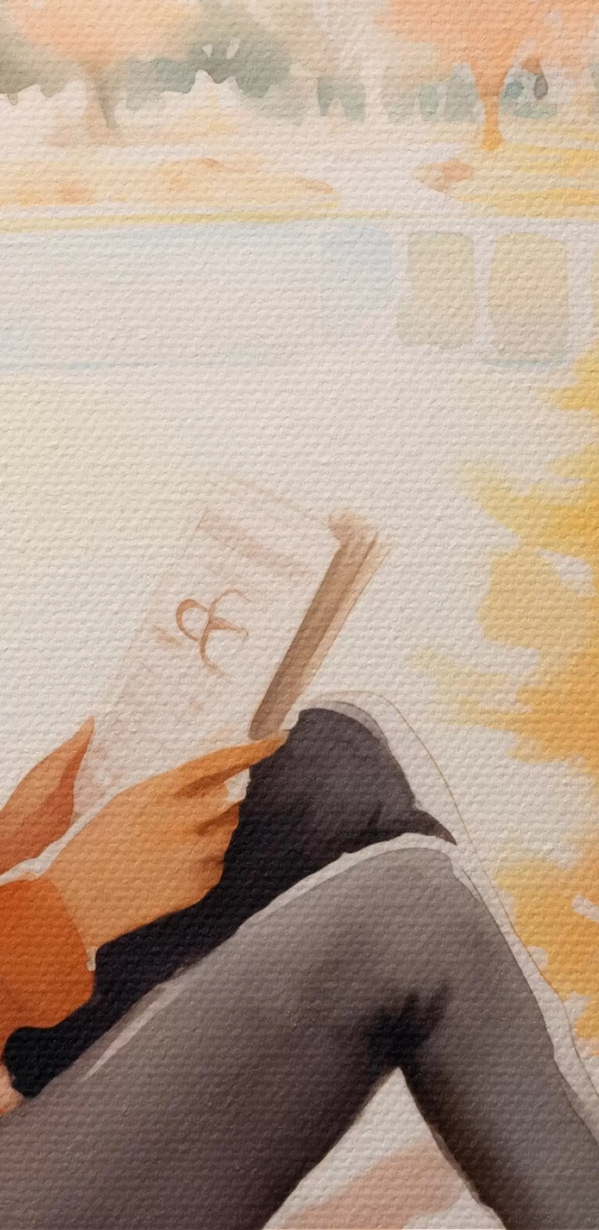Кругла картина Дівчина читає книгу біля відкритого вікна в осінній обстановці, на тлі світлих дерев і з чашкою чаю поруч Nr r42572