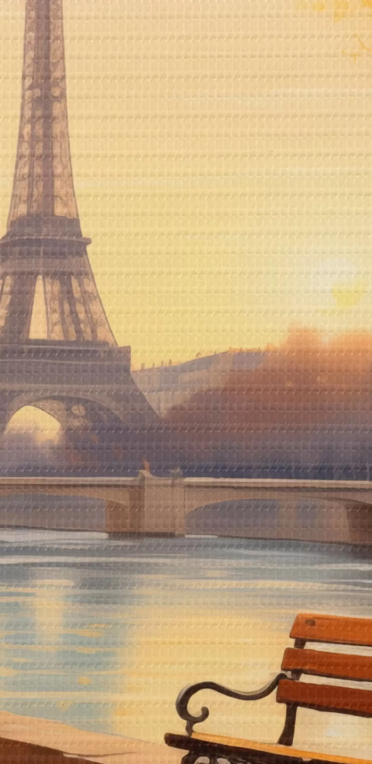 Кругла картина Осінь у Парижі з видом на Ейфелеву вежу, набережна Сена, вкрита листям, лавки та вуличні ліхтарі, що додають романтичної атмосфери. Nr r42577