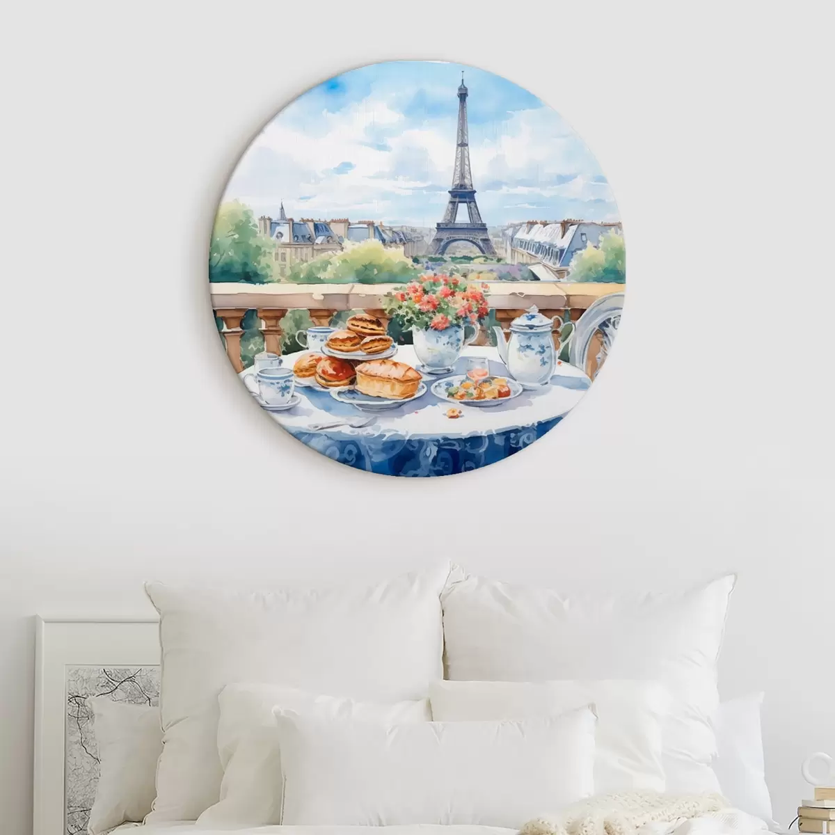 Кругла картина Романтичний вид на Ейфелеву вежу з балкона зі столом, накритим десертами, чаєм і квітами в літній атмосфері. Nr r42579