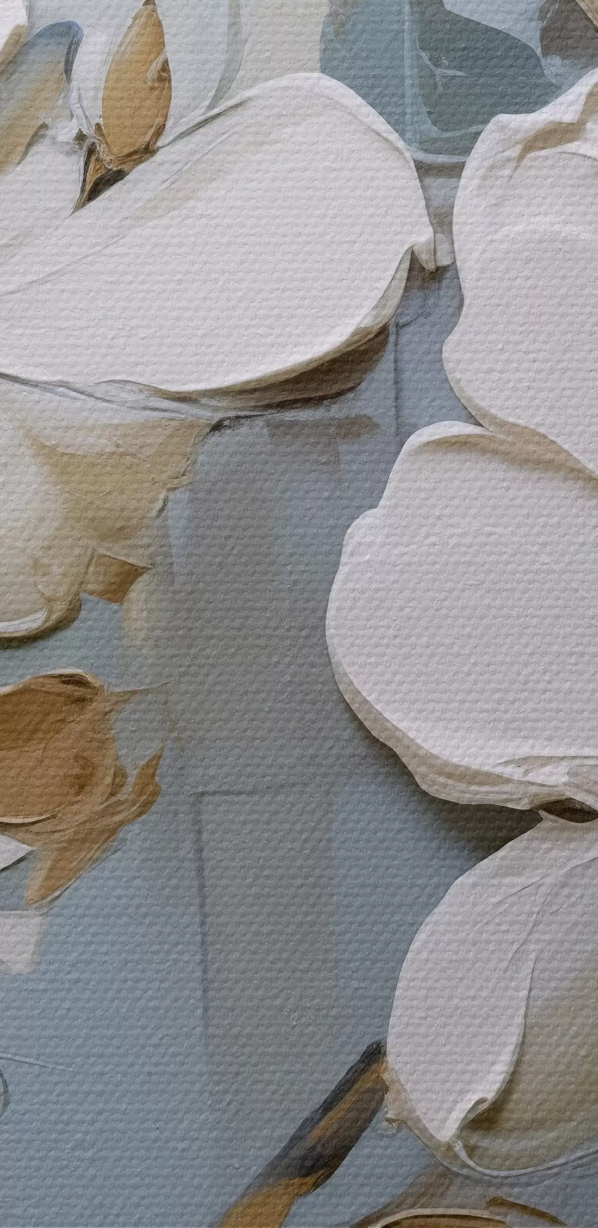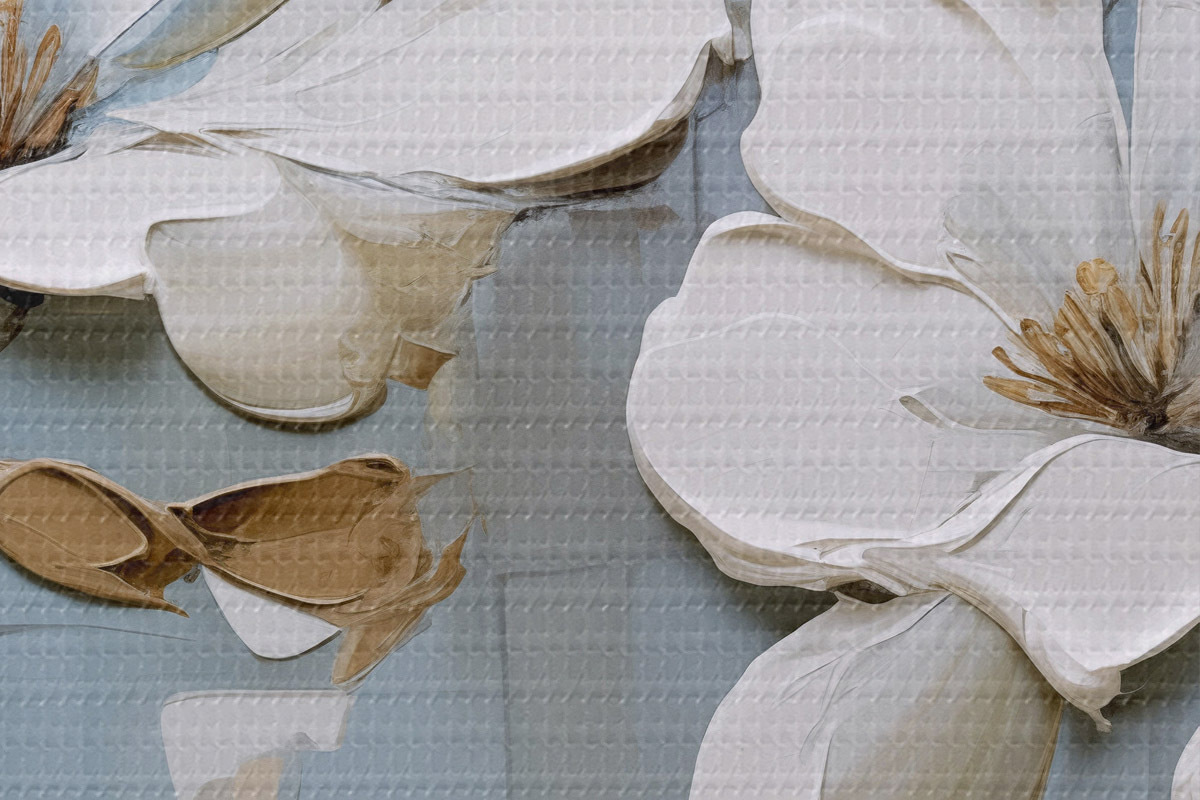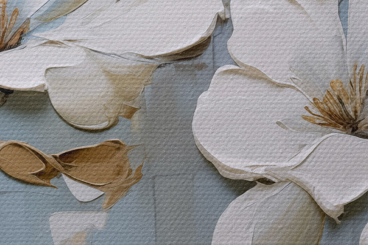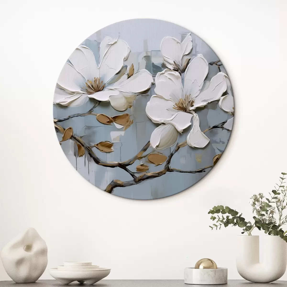 Кругла картина Білі квіти магнолії з фактурними пелюстками та коричневим листям на ніжно-блакитному тлі з імітацією олійного живопису Nr r42711