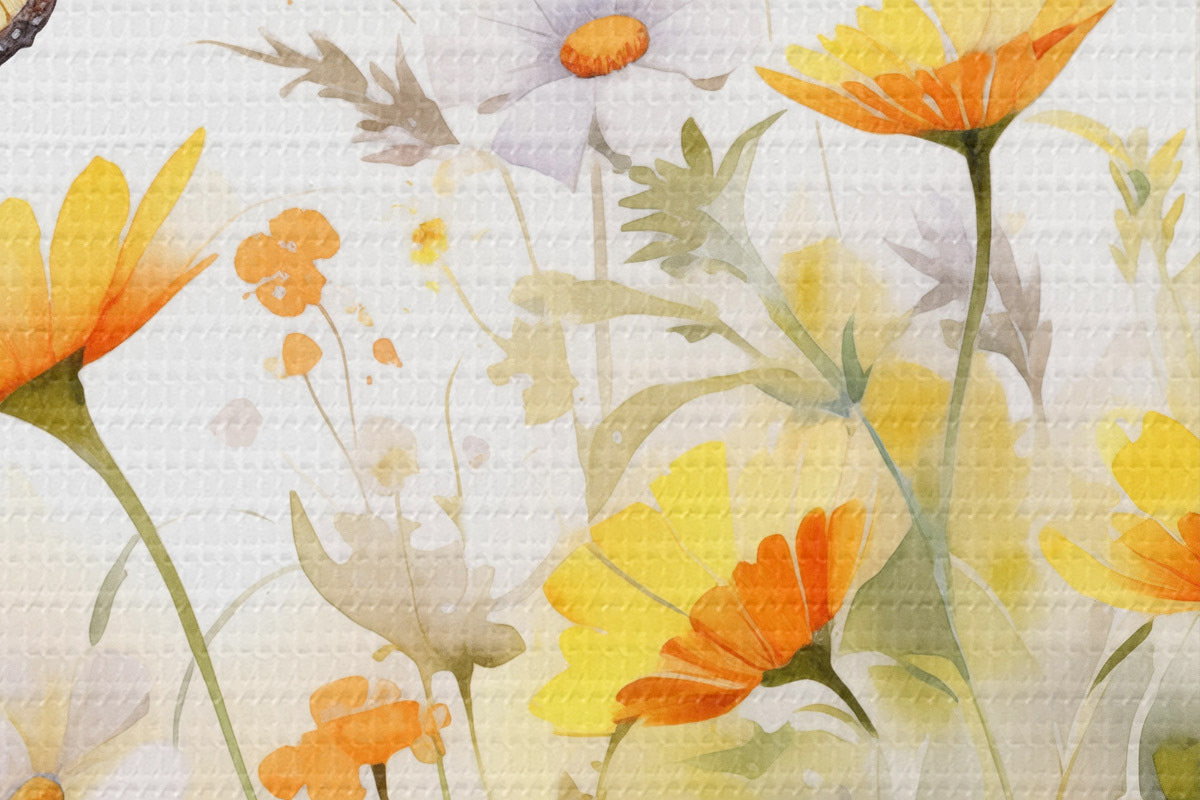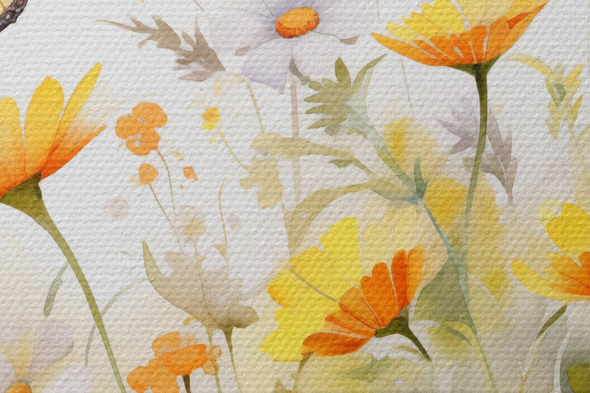 Кругла картина Яскраве акварельне поле квітів з помаранчевими та білими ромашками, а поруч пурхає метелик r42714