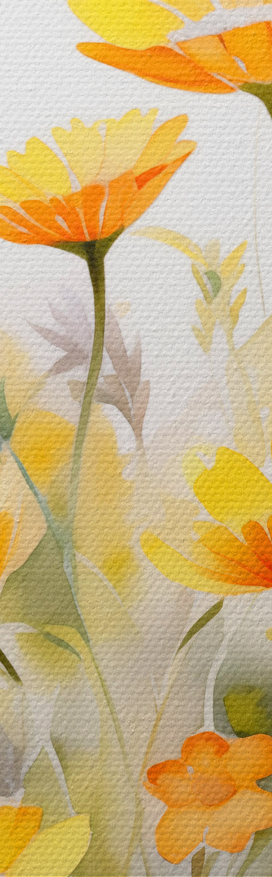 Кругла картина Яскраве акварельне поле квітів з помаранчевими та білими ромашками, а поруч пурхає метелик Nr r42714