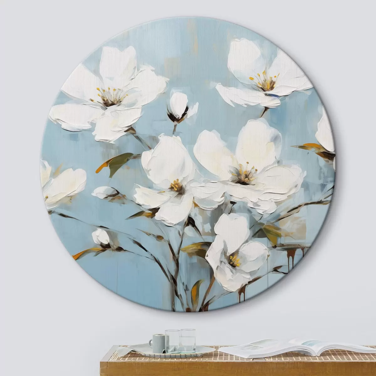 Кругла картина Білі квіти з ніжними пелюстками та зеленим листям на світло-блакитному тлі з імітацією олійного живопису r42719