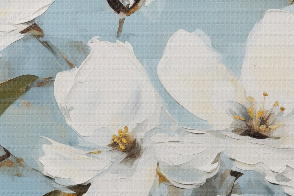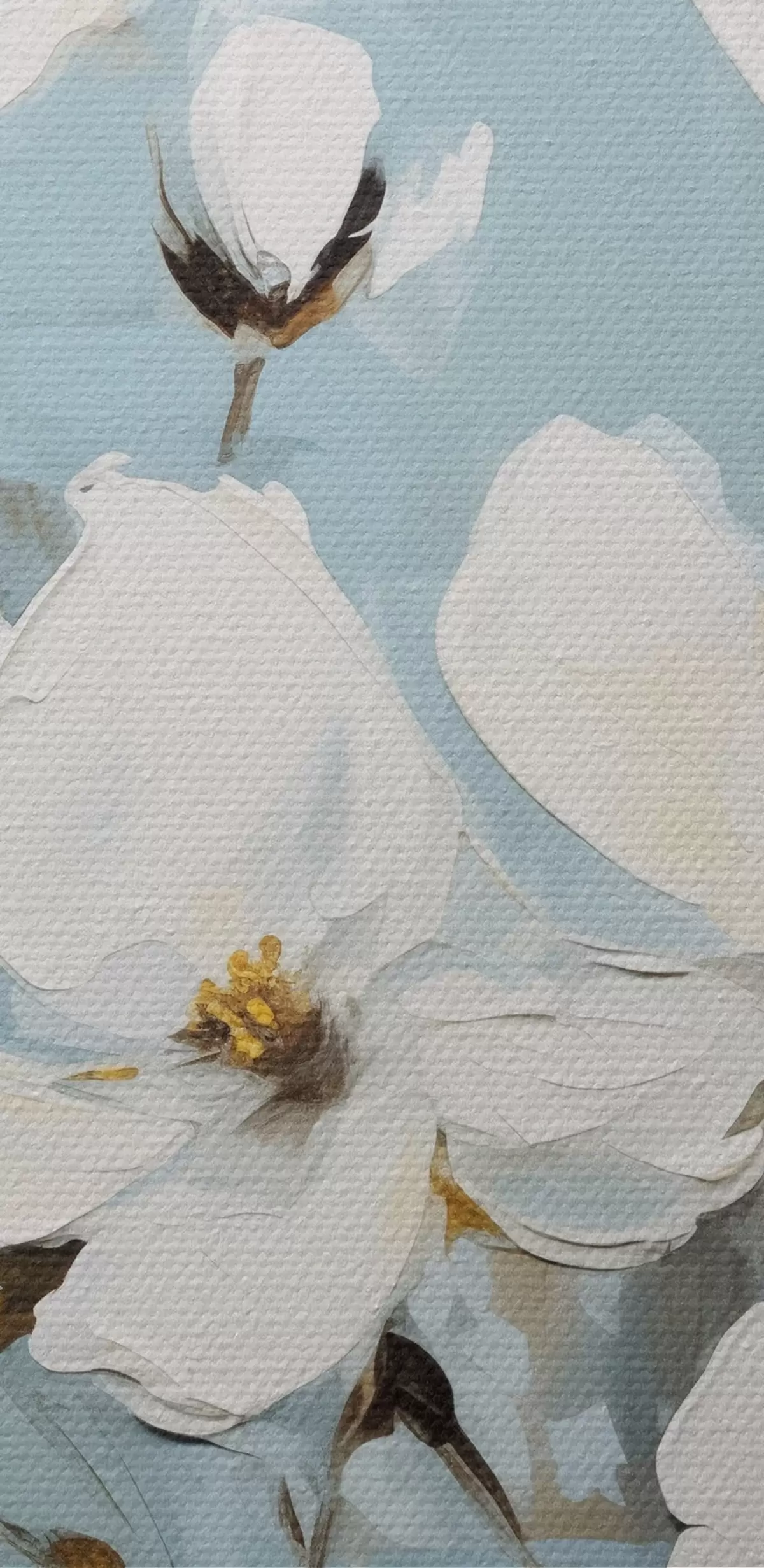 Кругла картина Білі квіти з ніжними пелюстками та зеленим листям на світло-блакитному тлі з імітацією олійного живопису Nr r42719