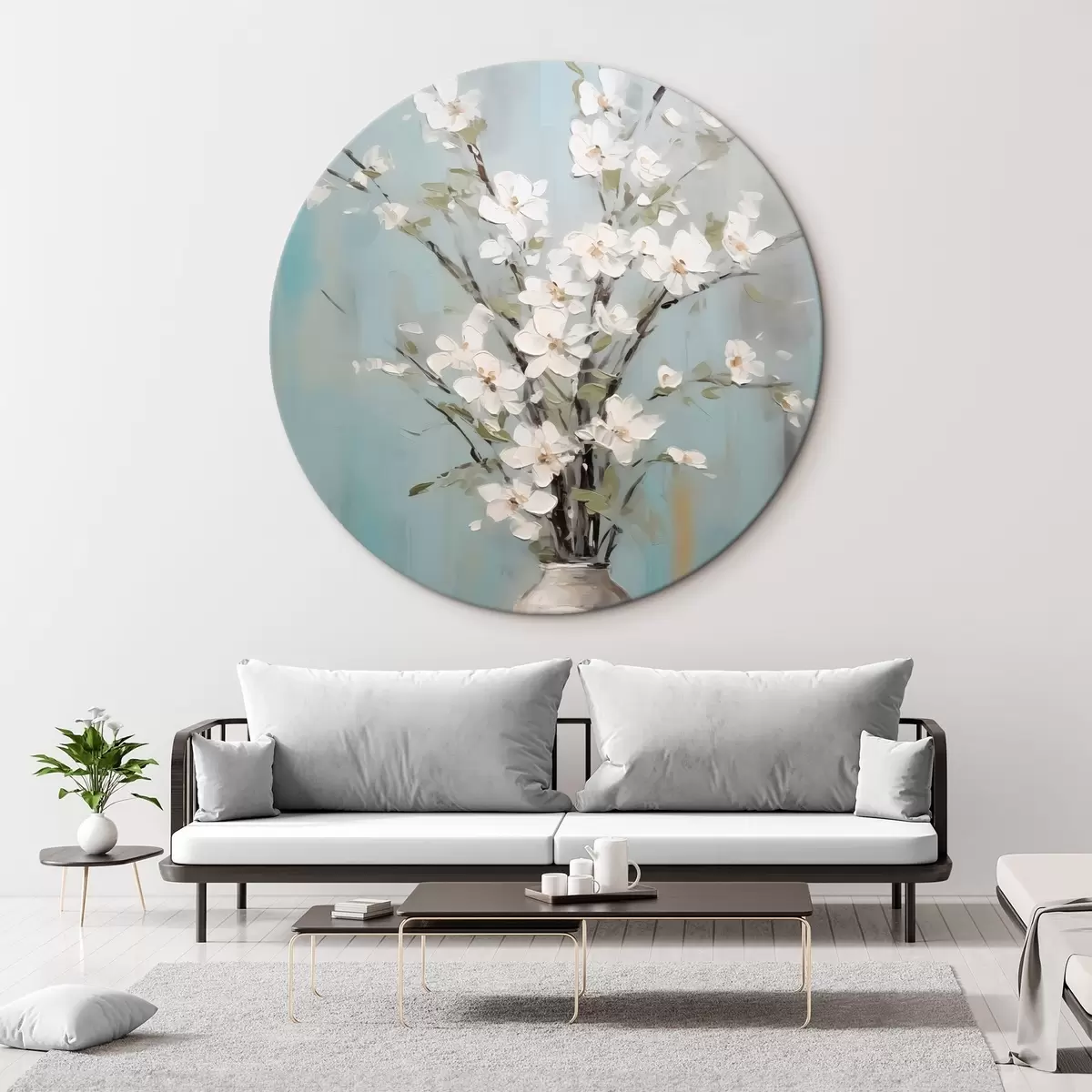 Кругла картина Гілки з білими квітами у вазі Nr r42746