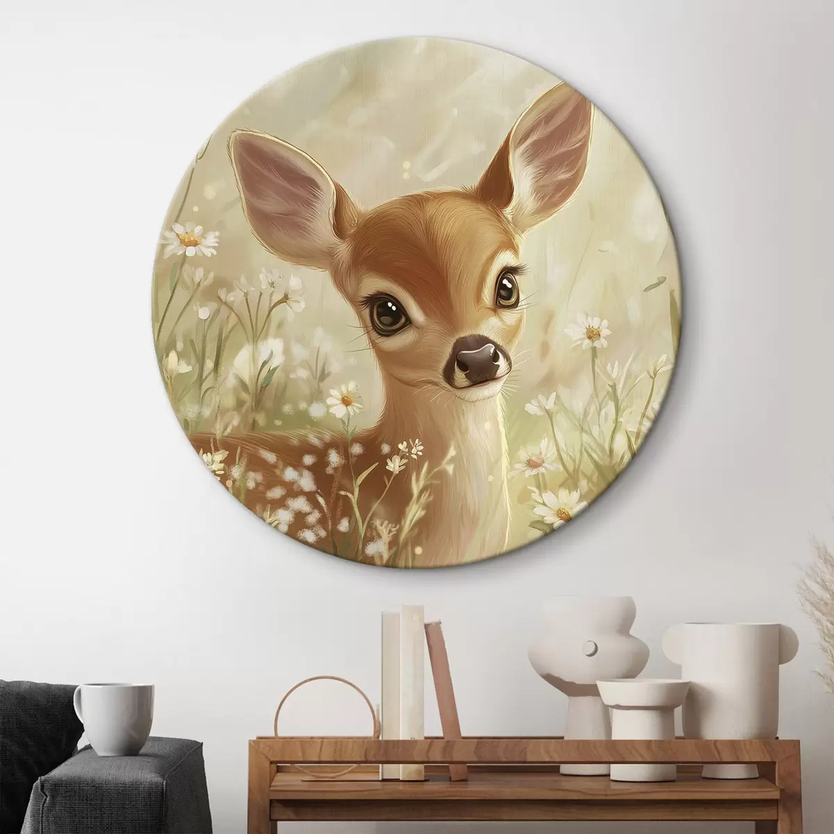 Кругла картина Симпатичний олень на лузі з квітами маргариток, малюнок олією r42780