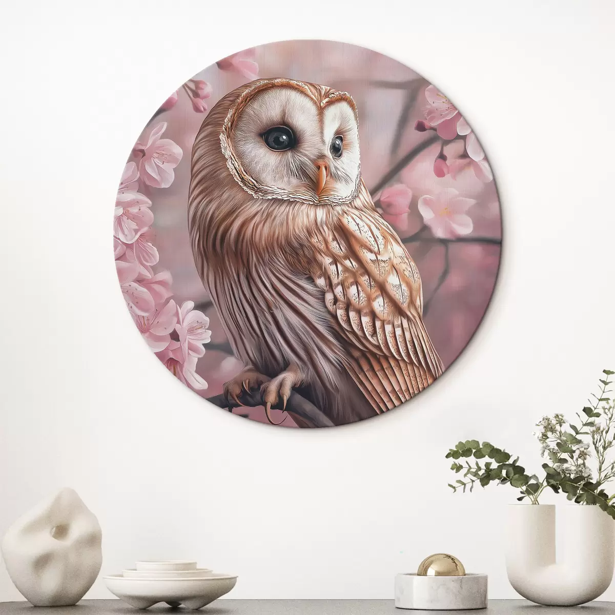 Кругла картина Сова на вишні, рожеві квіти, реалізм, природа Nr r42785