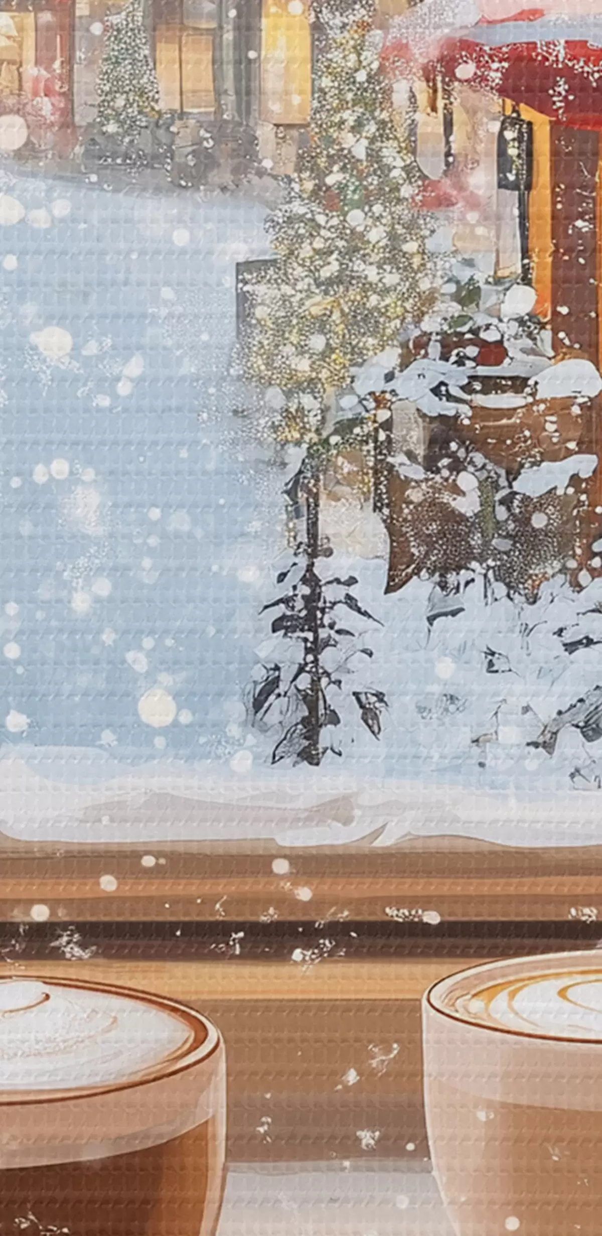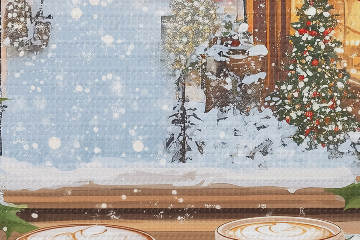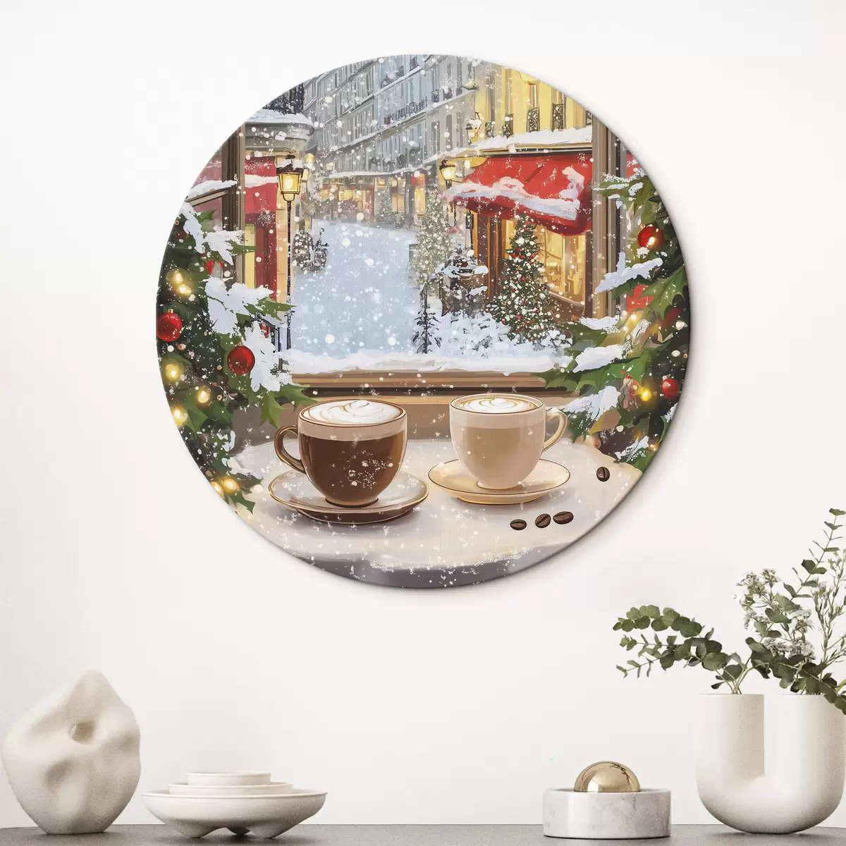 Кругла картина Затишне зимове кафе, філіжанки кави, акриловий стиль, стара архітектура міста Nr r42795