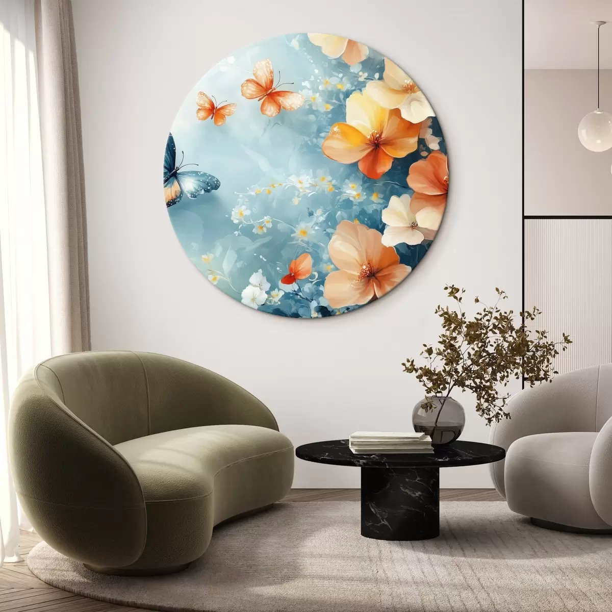 Кругла картина Помаранчеві квіти та метелики Nr r42974