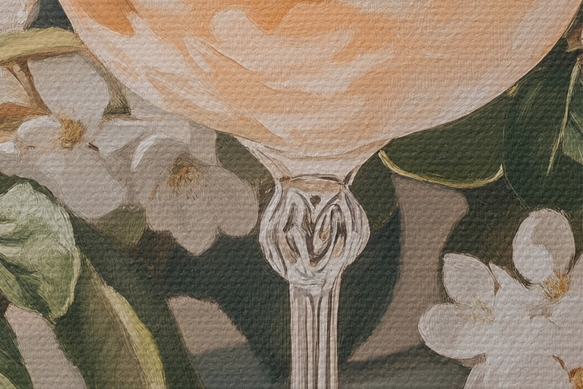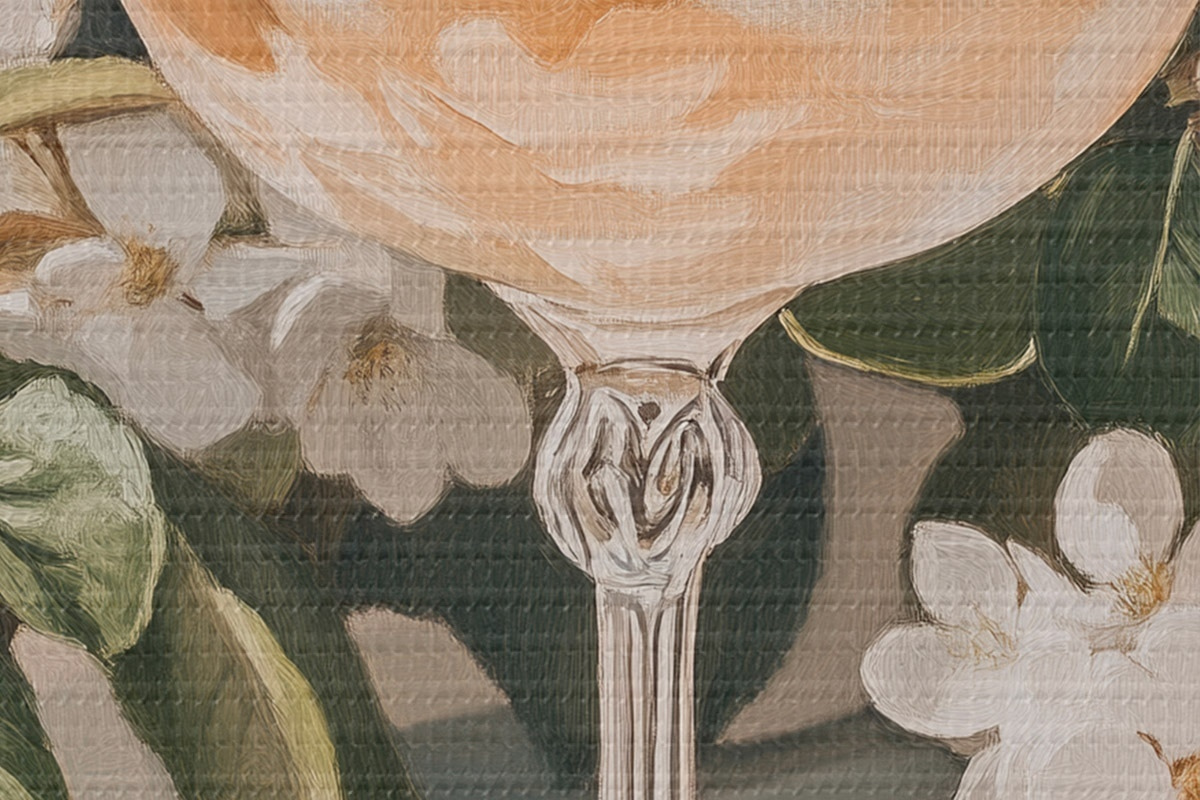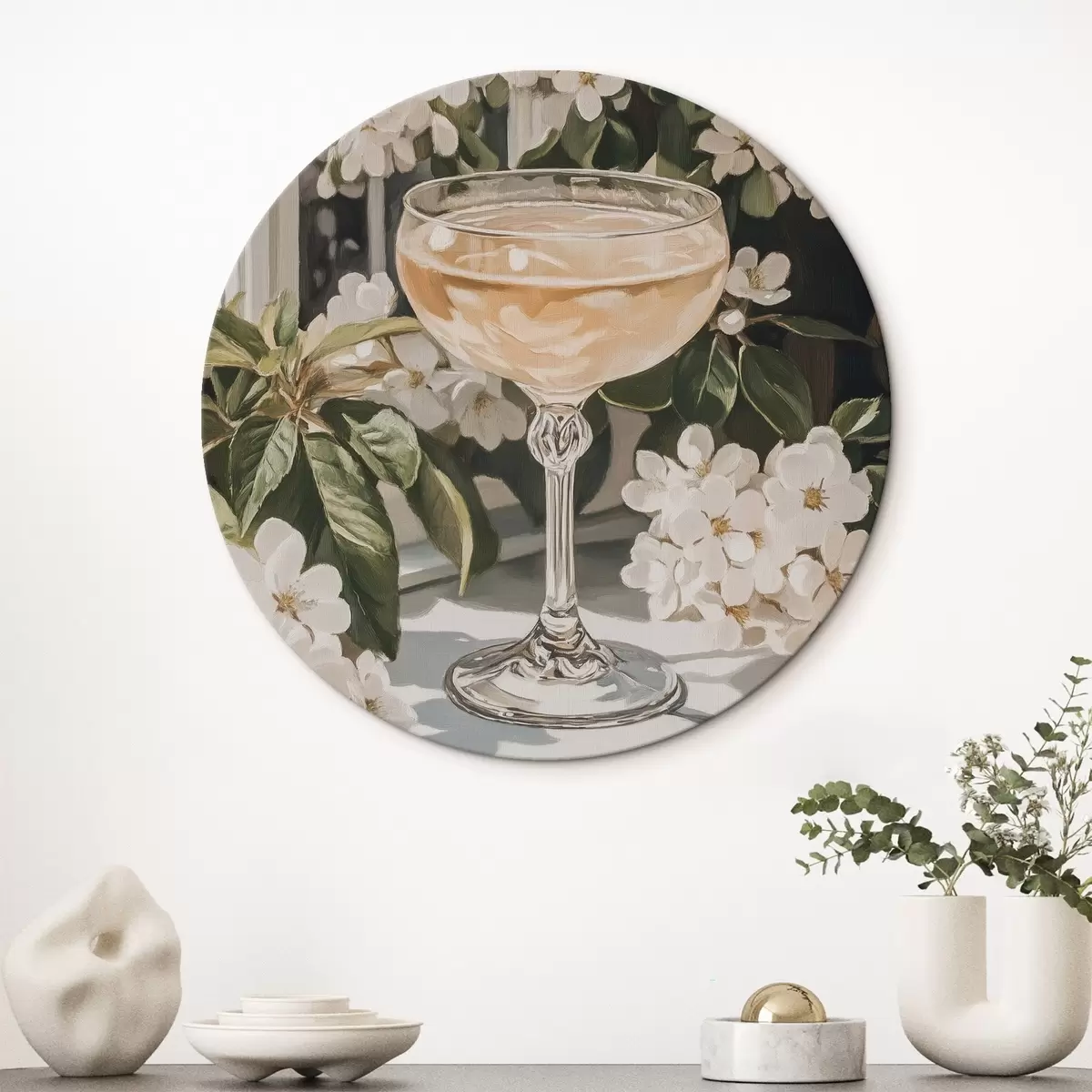 Кругла картина Келих шампанського, вінтаж, акварельний стиль, білі квіти Nr r43051