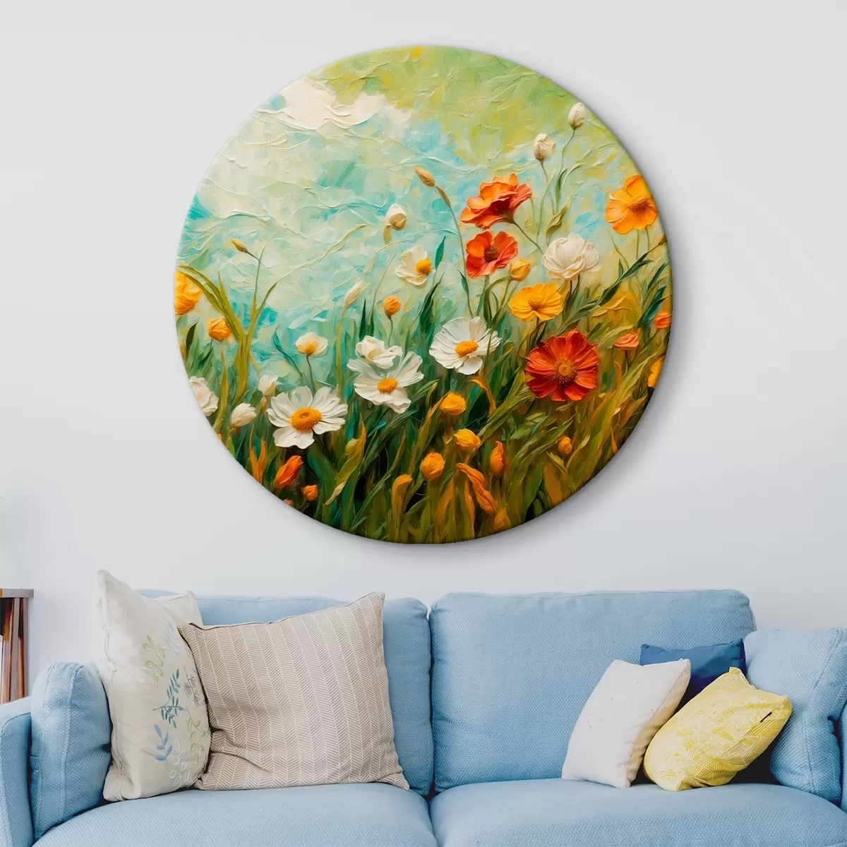 Кругла картина Поле квітів на абстрактному тлі блакитного неба Nr r43100