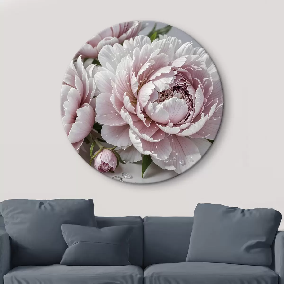 Кругла картина Світло-рожеві та білі півонії з крапельками води на пелюстках, тло - біла поверхня Nr r43158