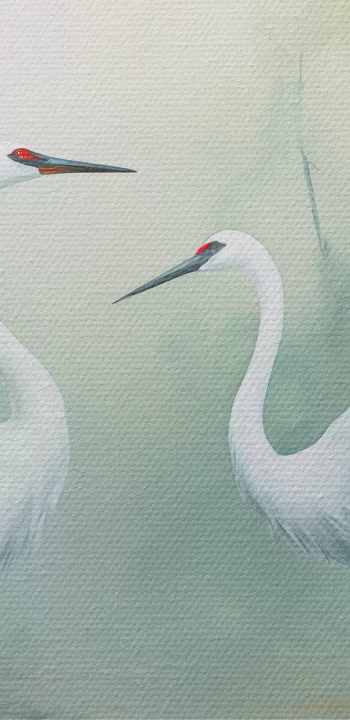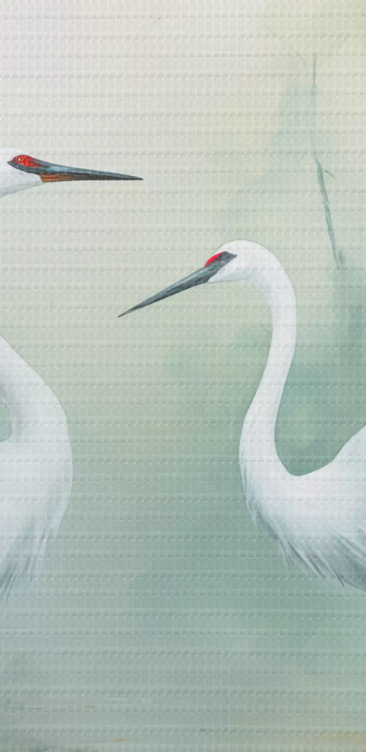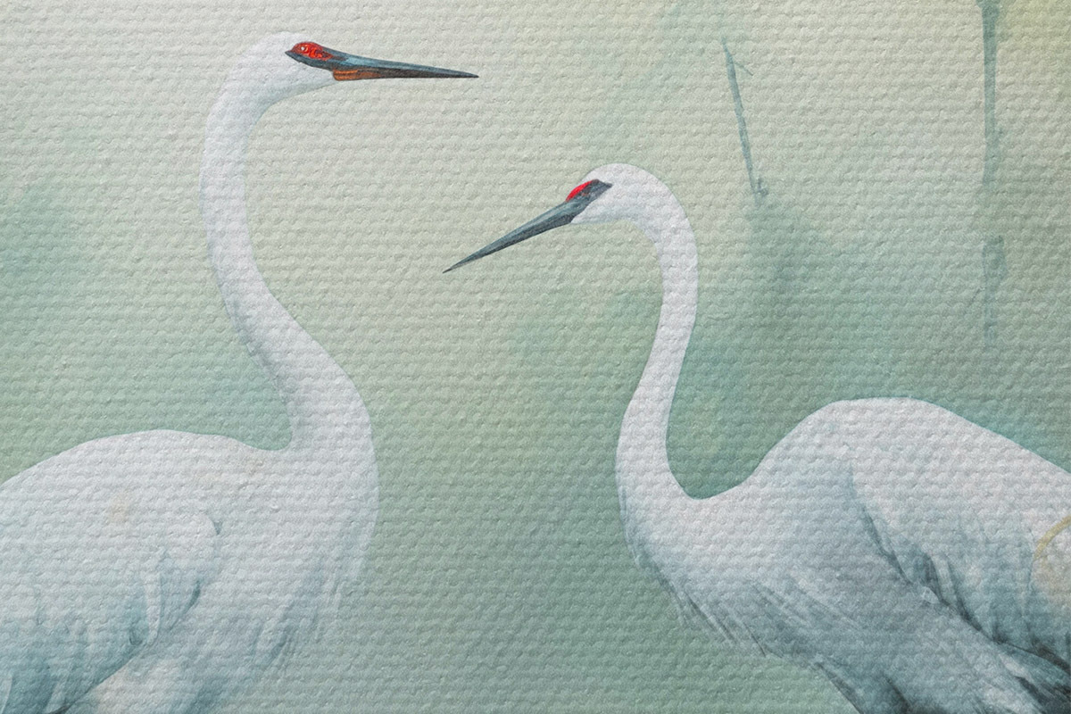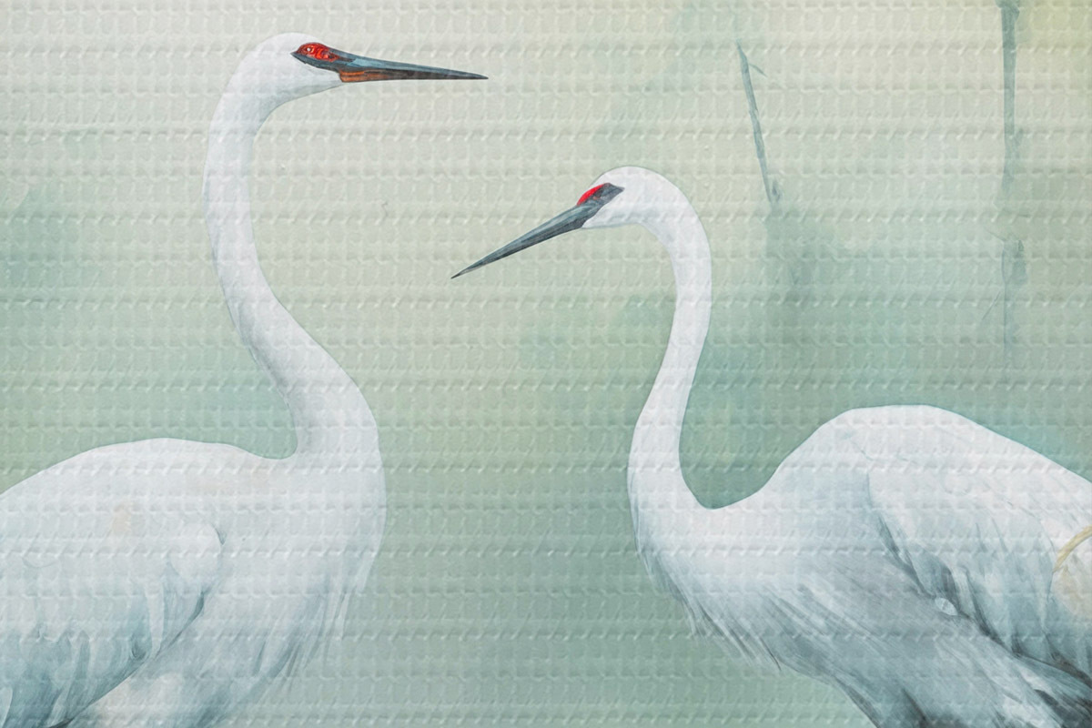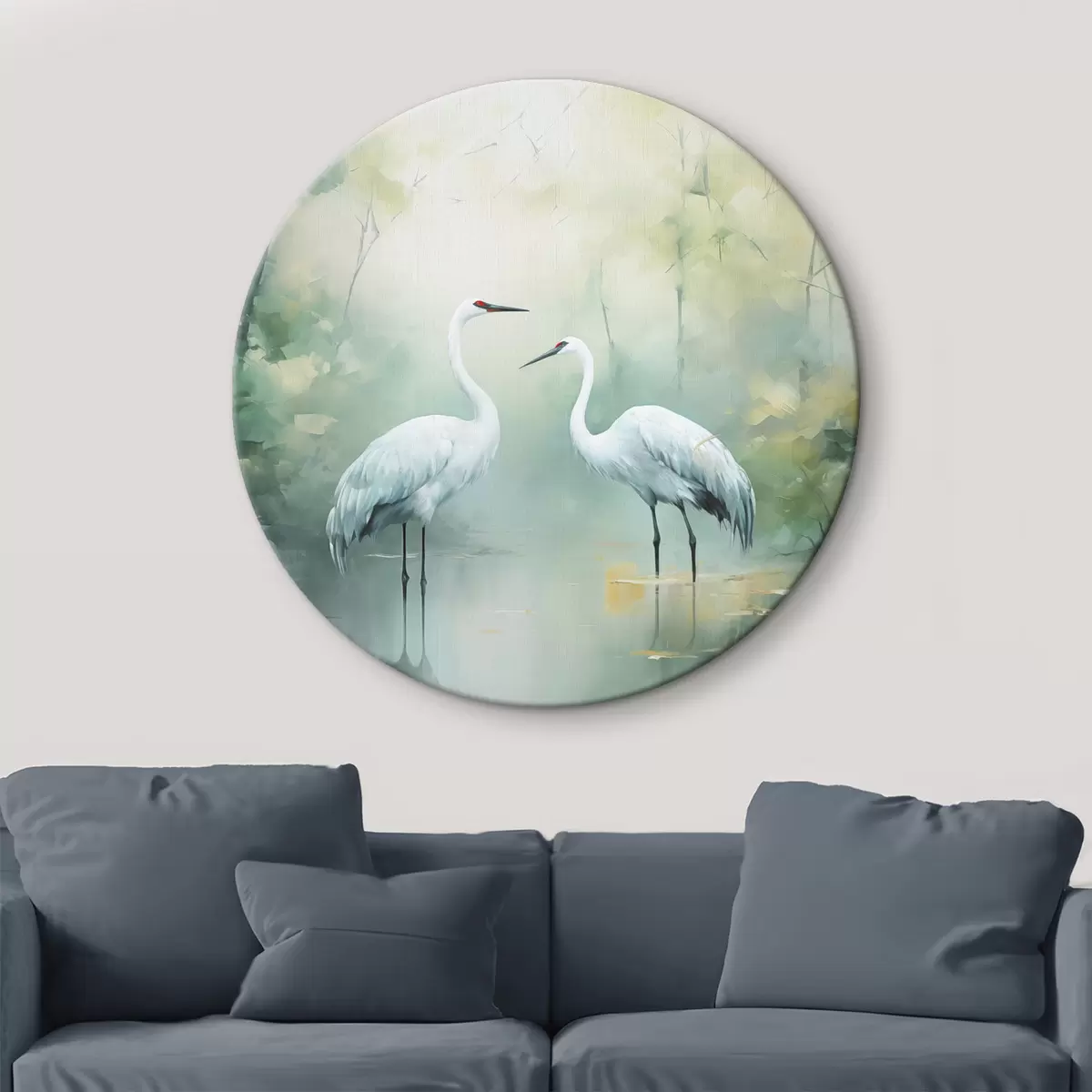 Кругла картина Два білі журавлі стоять у ставку, оточені пишним зеленим лісом з м'яким, розсіяним освітленням Nr r43166