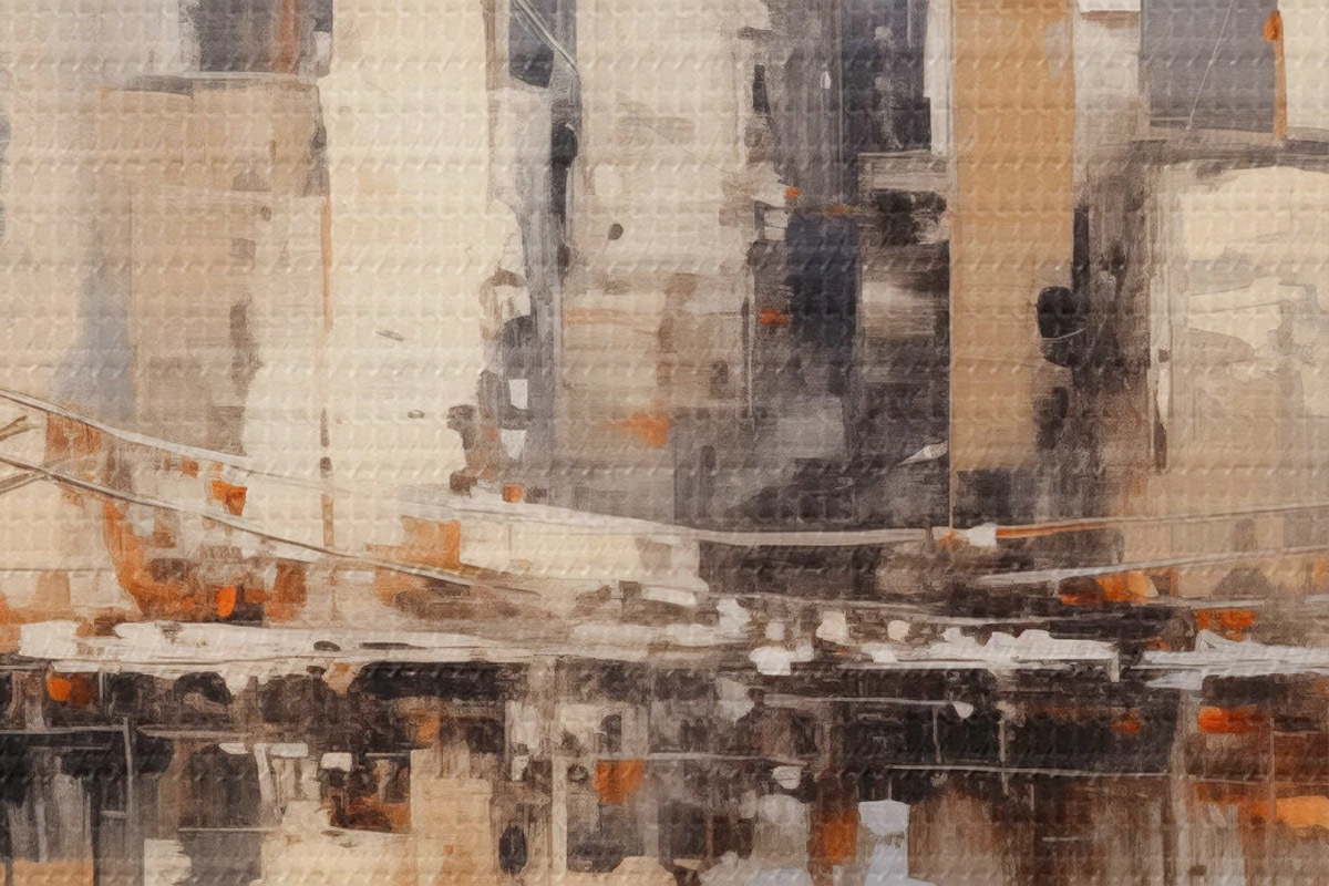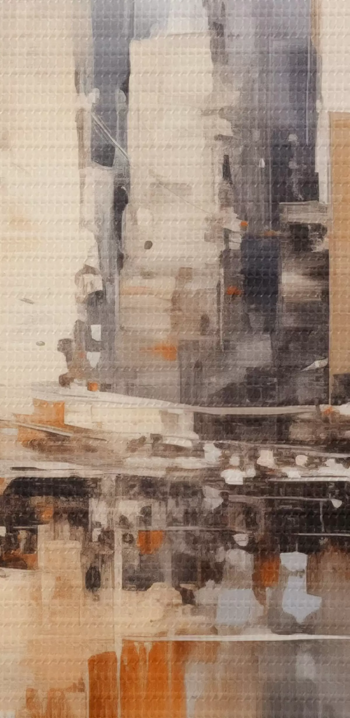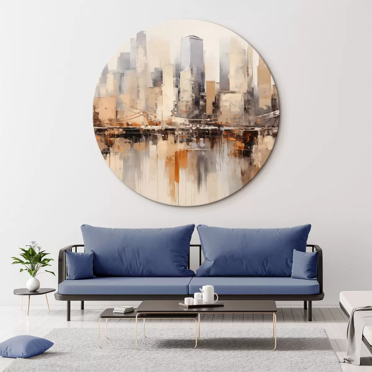 Кругла картина Абстрактний міський пейзаж з високими будівлями у відтінках коричневого, сірого та білого, що відображаються у воді внизу Nr r43168