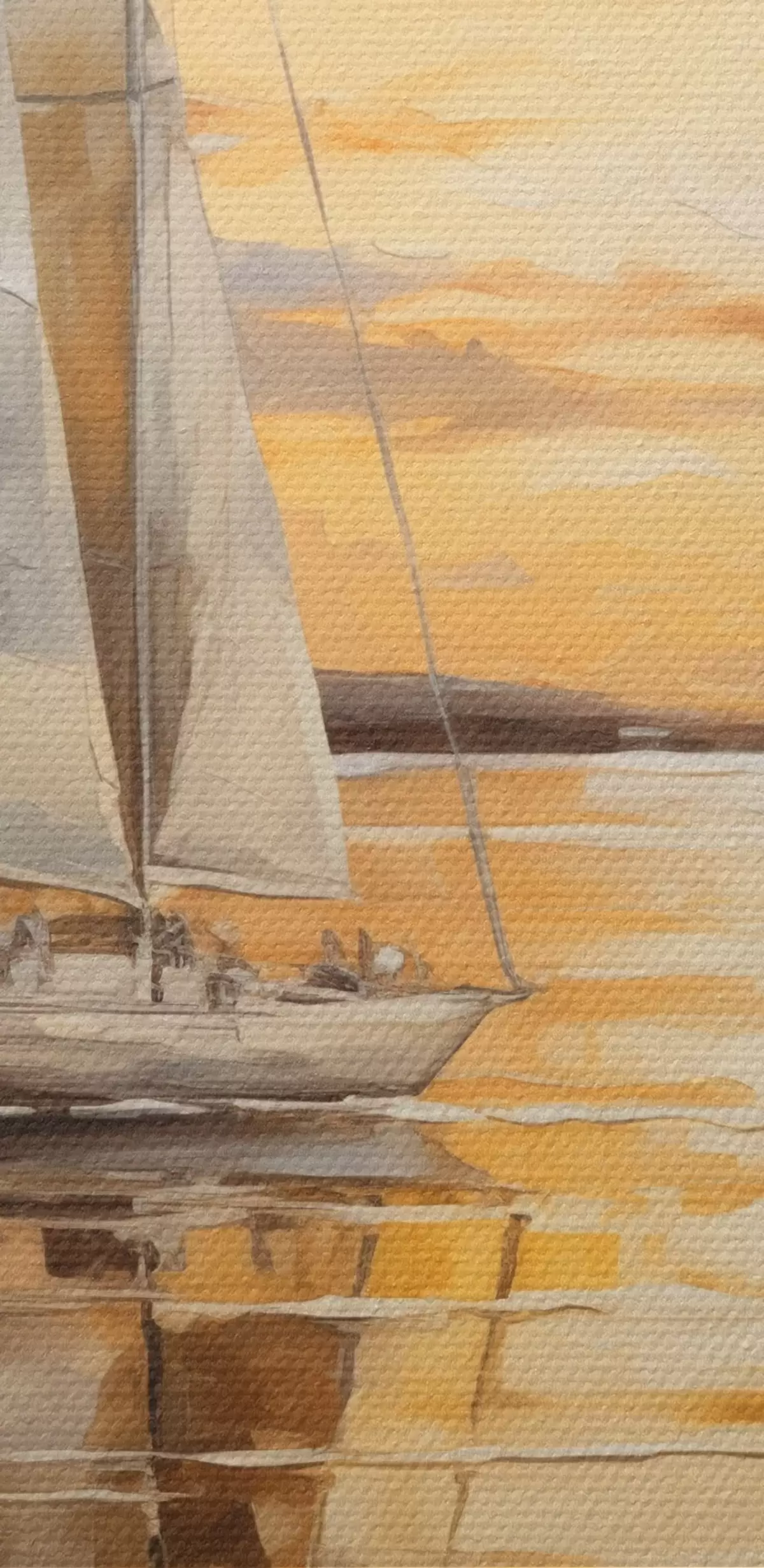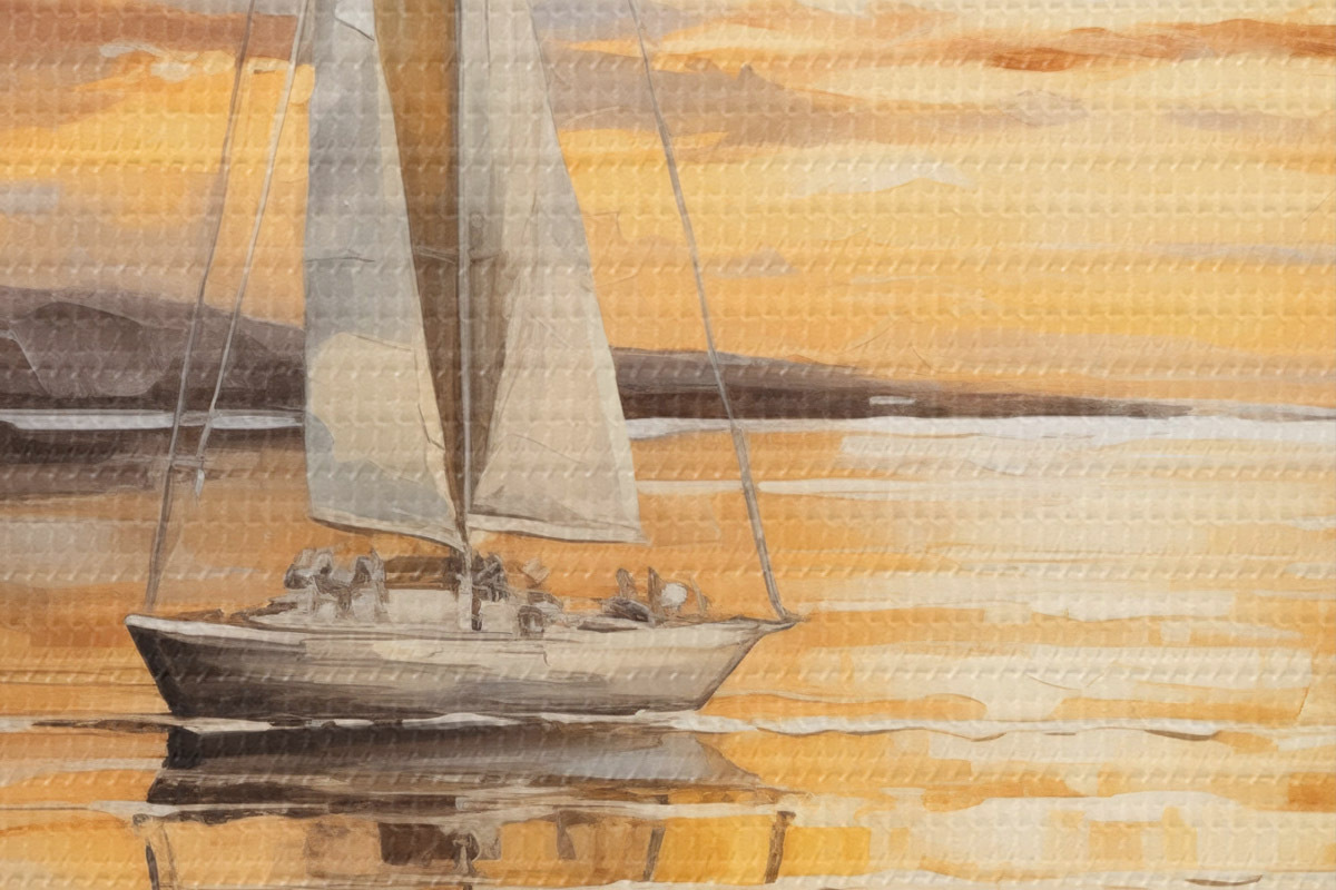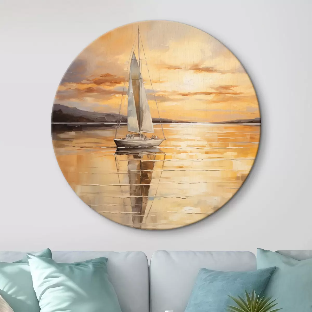 Кругла картина Пейзажна картина з вітрильником на тлі спокійного моря, помаранчево-жовтого неба, далеких гір Nr r43169