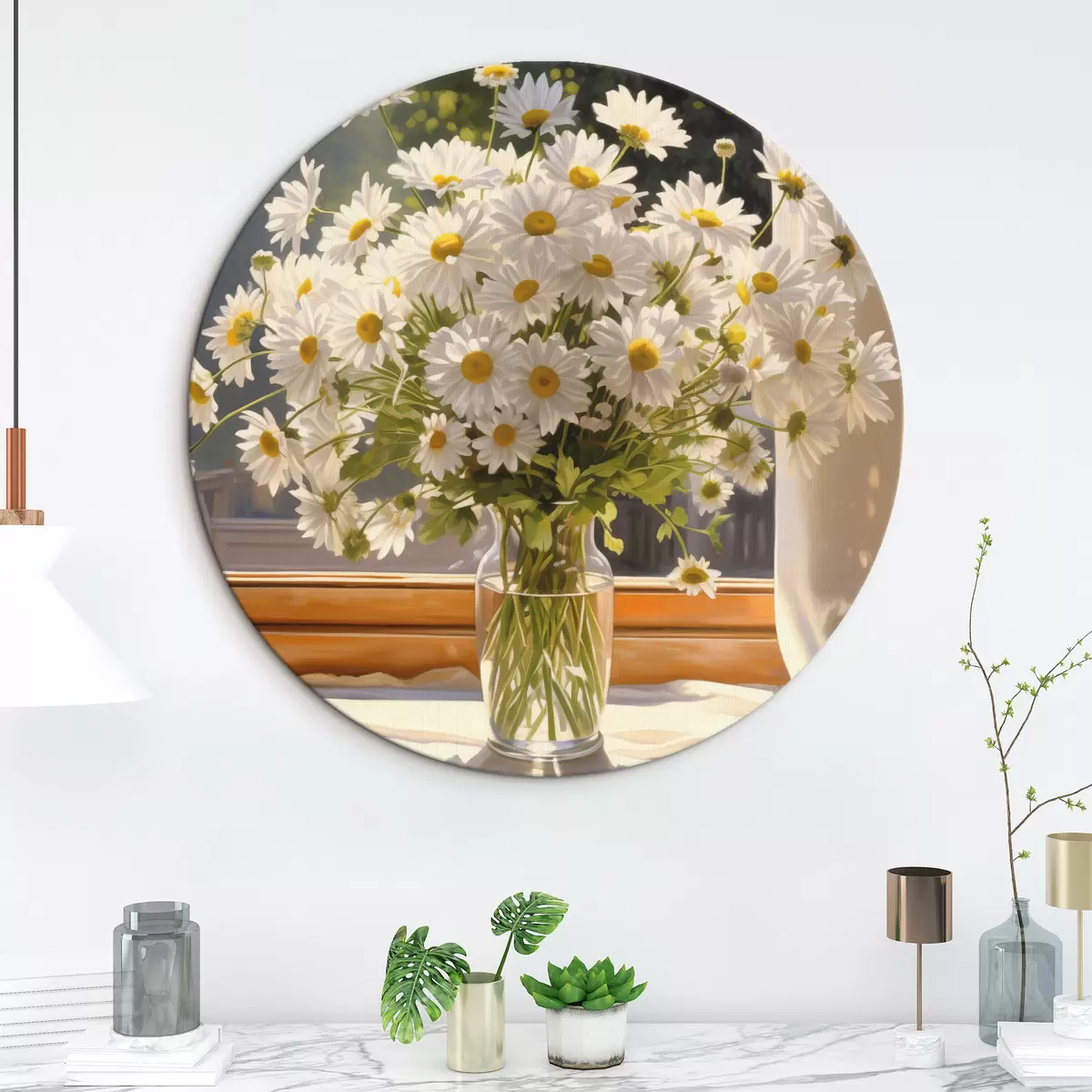 Кругла картина Олійний живопис, імітація вази з білими ромашками на підвіконні, сонячний день, теплі кольори палітри Nr r43171