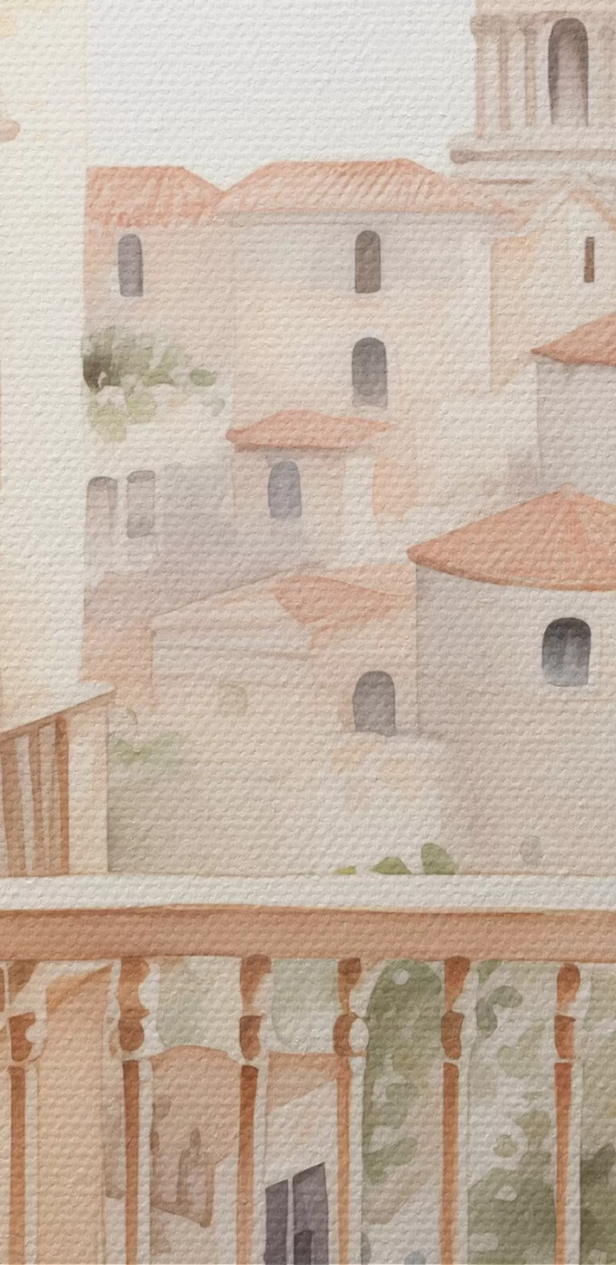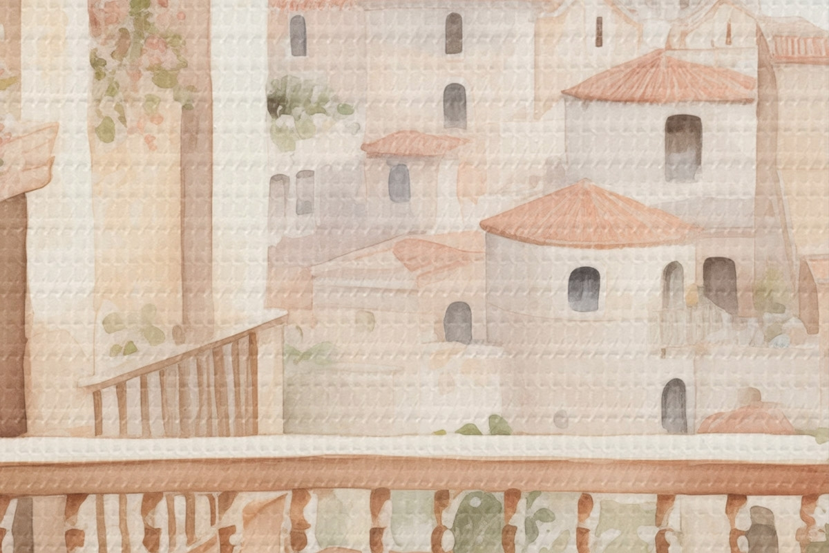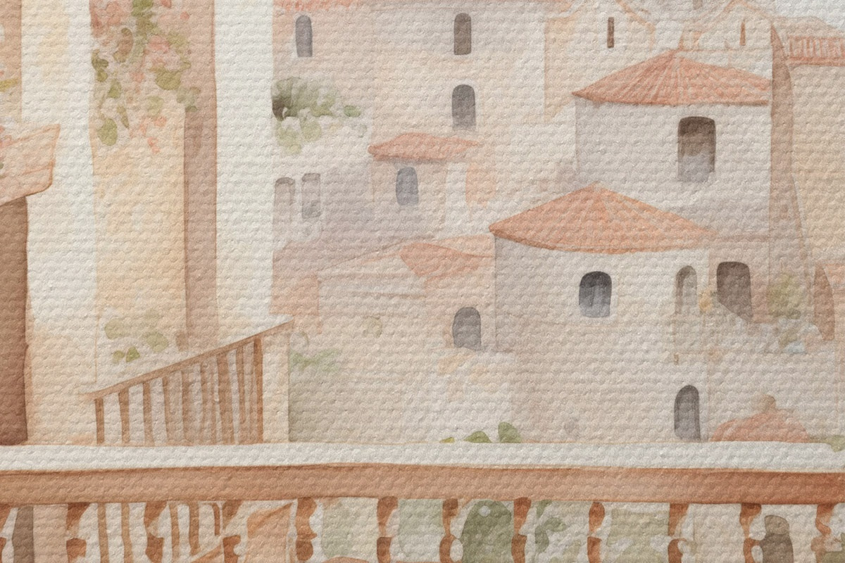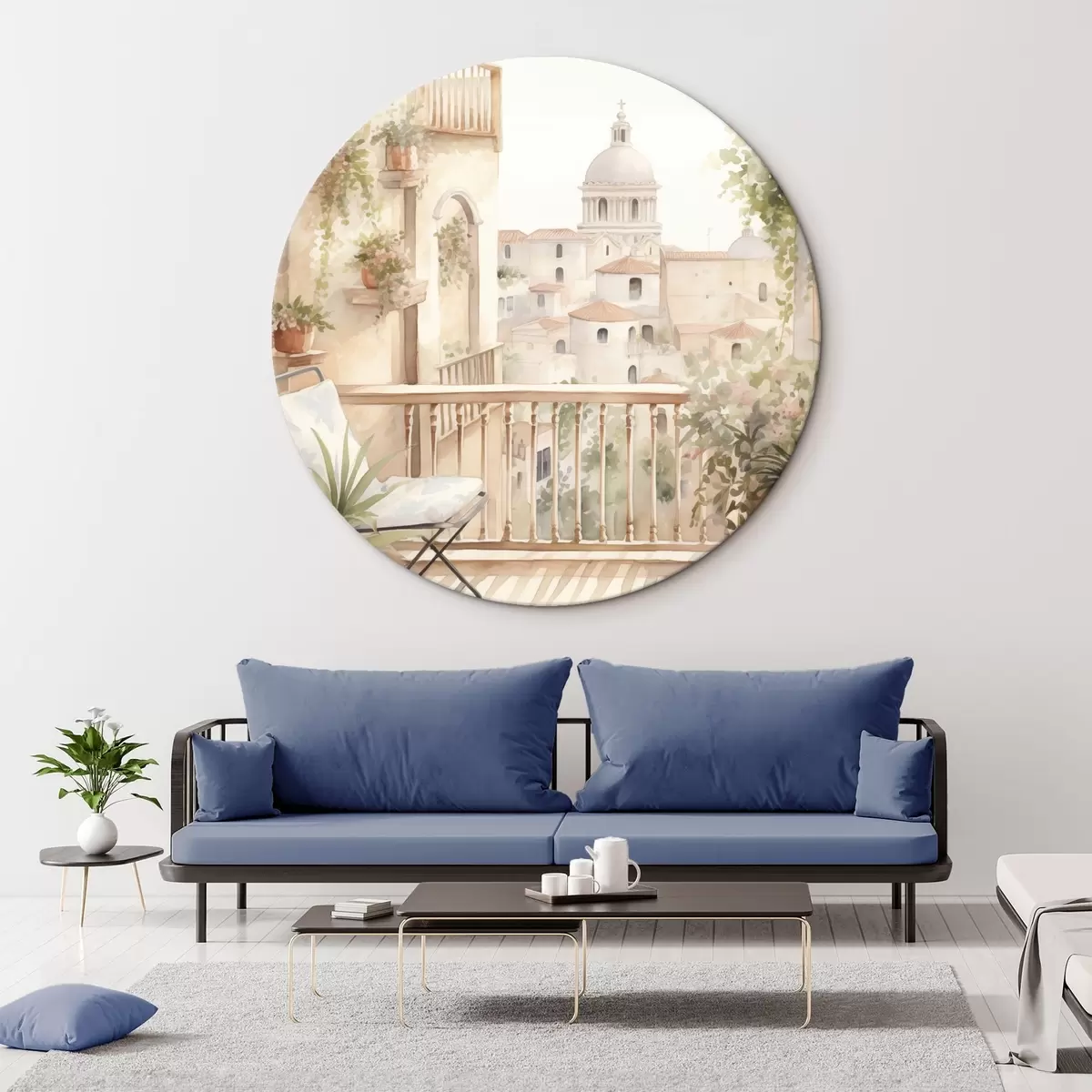 Кругла картина Естетичний літній балкон, Іспанія, стара архітектура, блуммінг, акварельний стиль Nr r43180