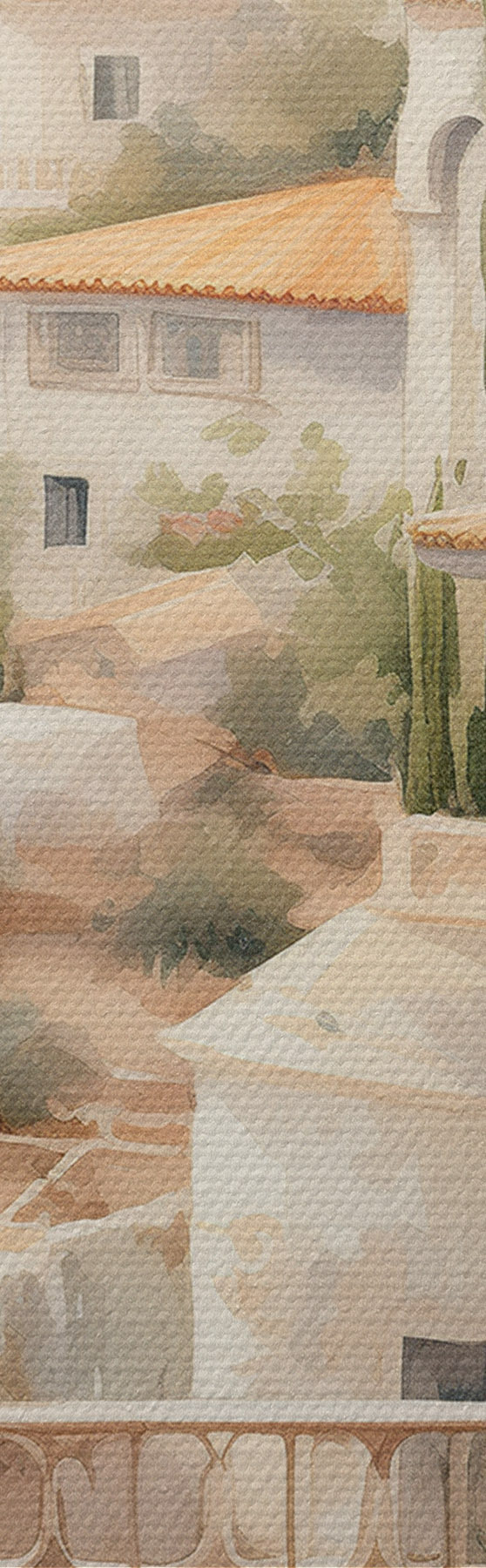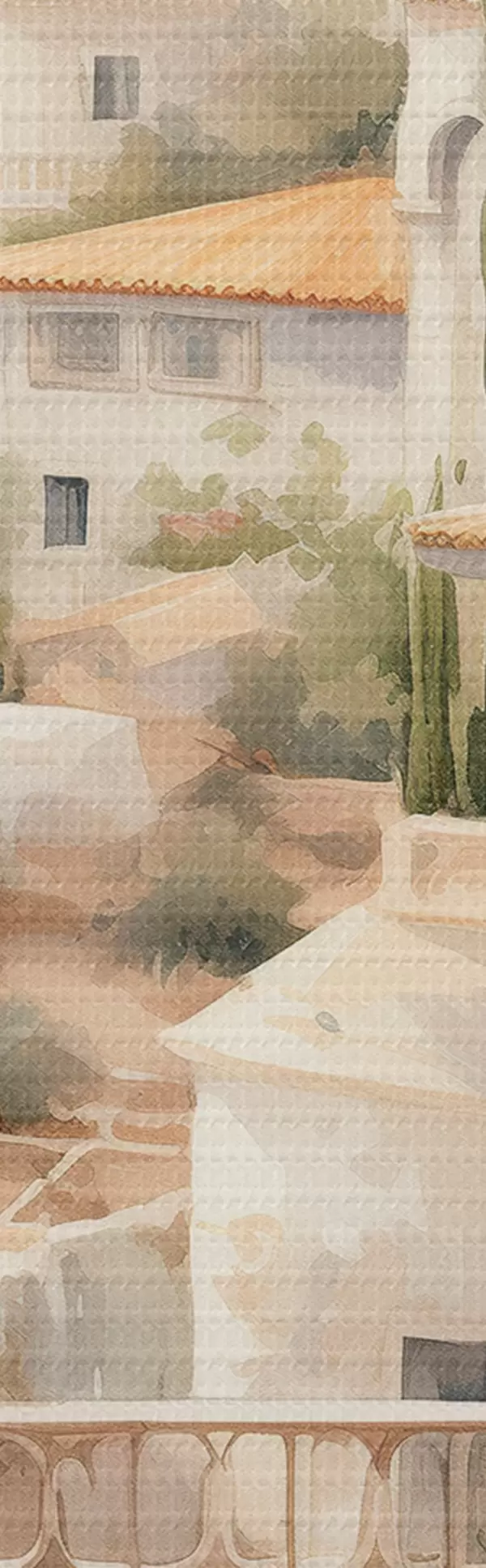 Кругла картина Літній пейзаж Іспанії, середземноморська архітектура, акварельний стиль Nr r43181