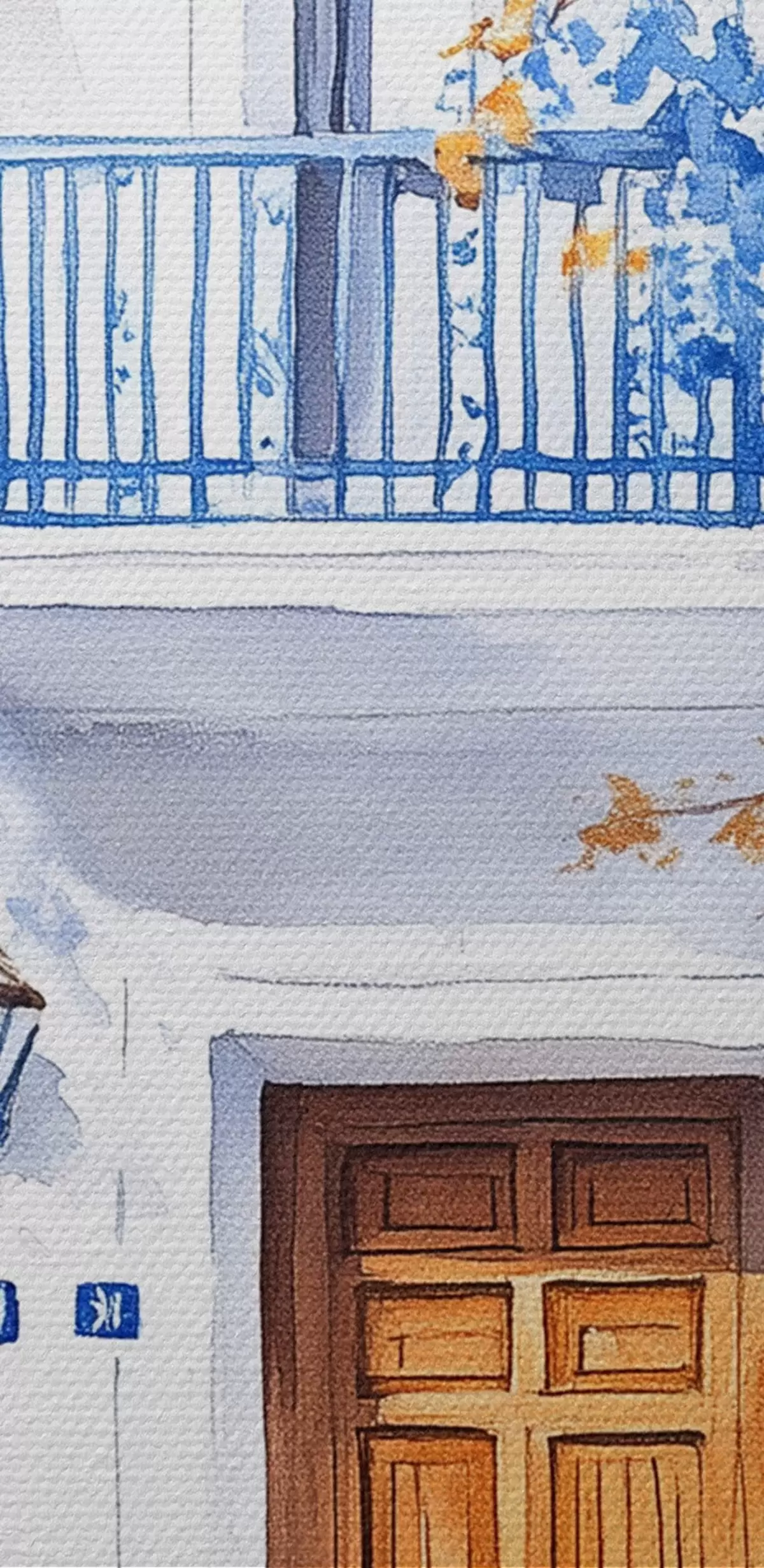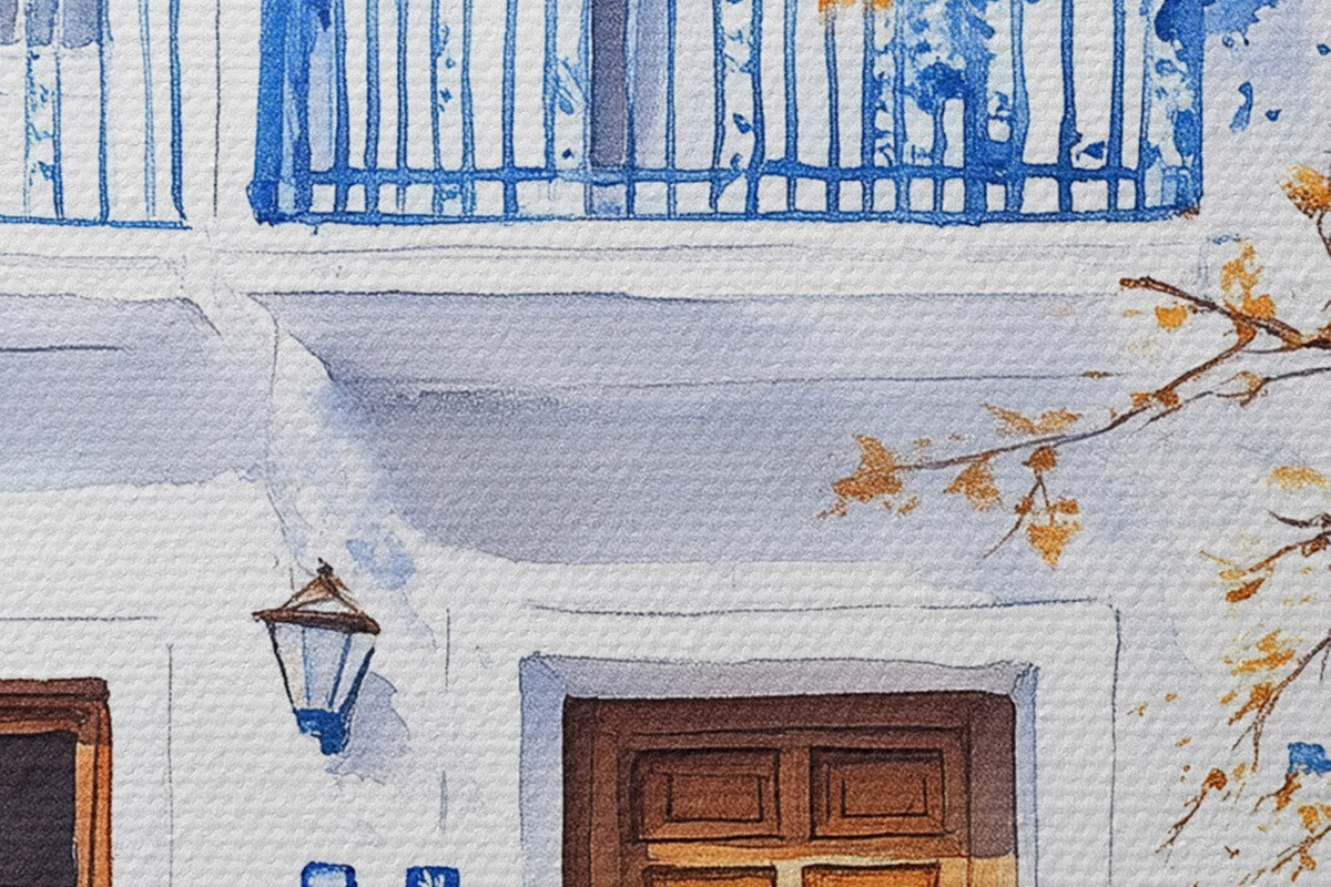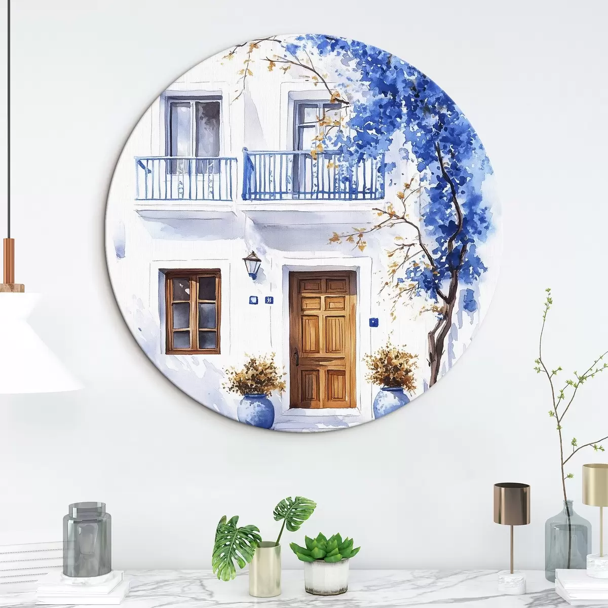 Кругла картина Квітуче дерево з блакитними квітами, білий будинок, Греція, акварель r43183
