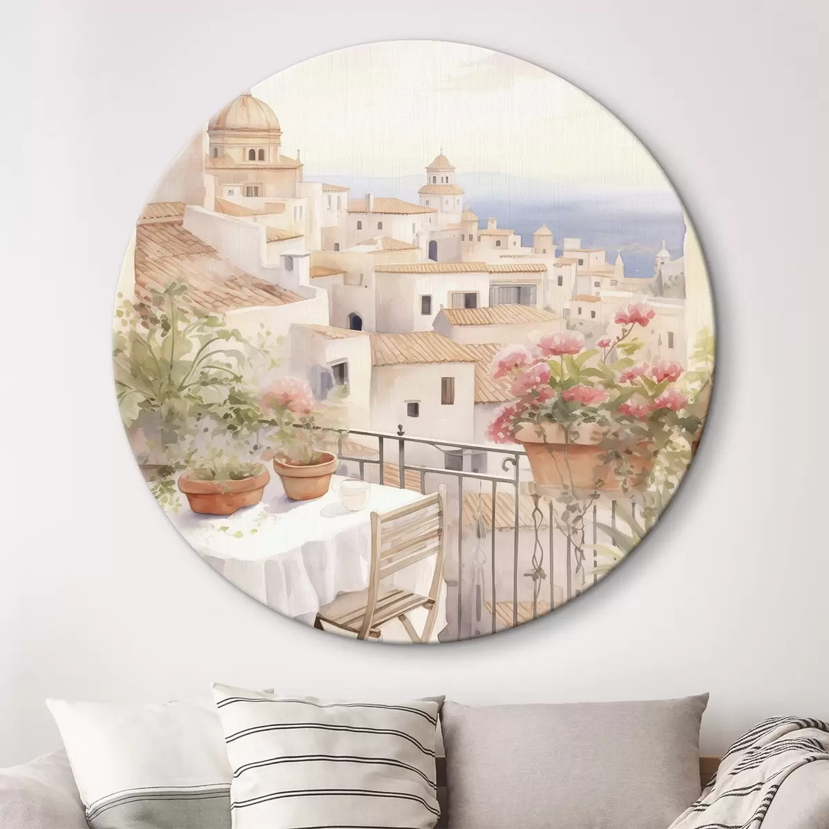 Кругла картина Захід сонця на балконі, Італія, архітектура, квітучі квіти, акварельний стиль Nr r43184
