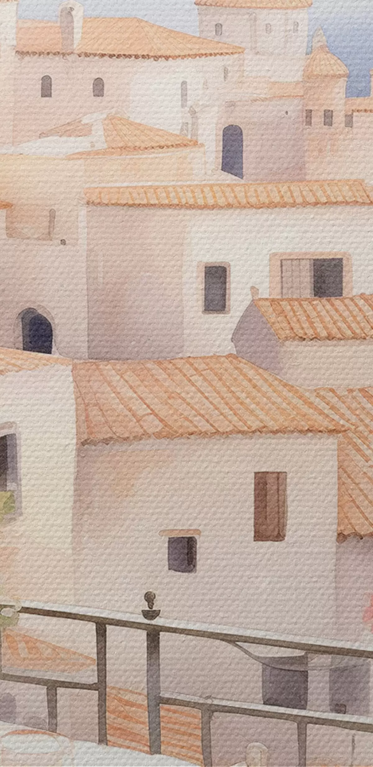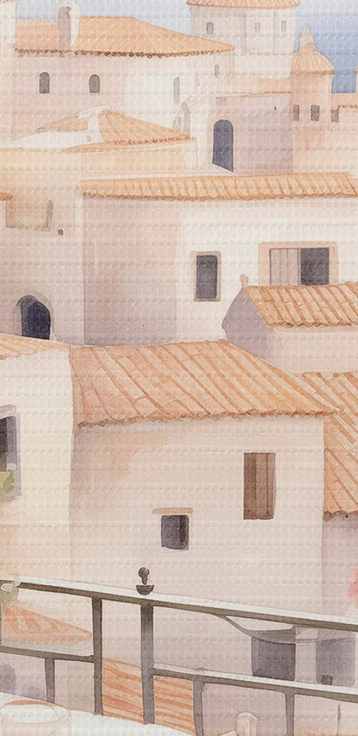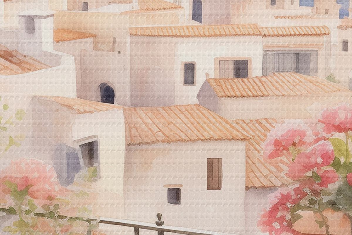 Кругла картина Захід сонця на балконі, Італія, архітектура, квітучі квіти, акварельний стиль r43184