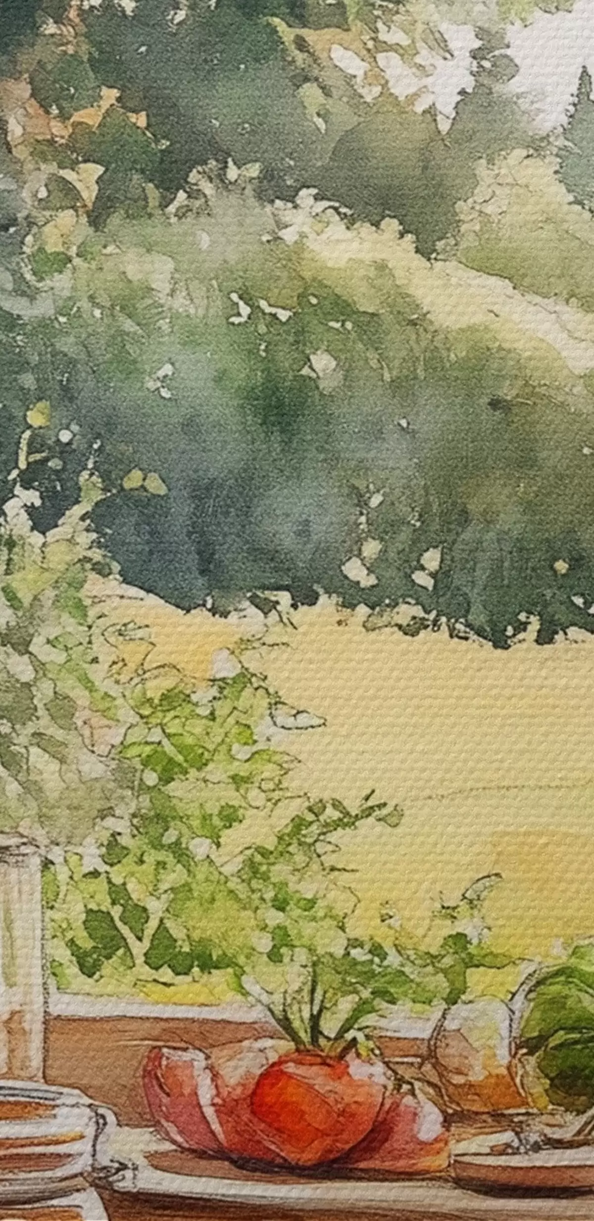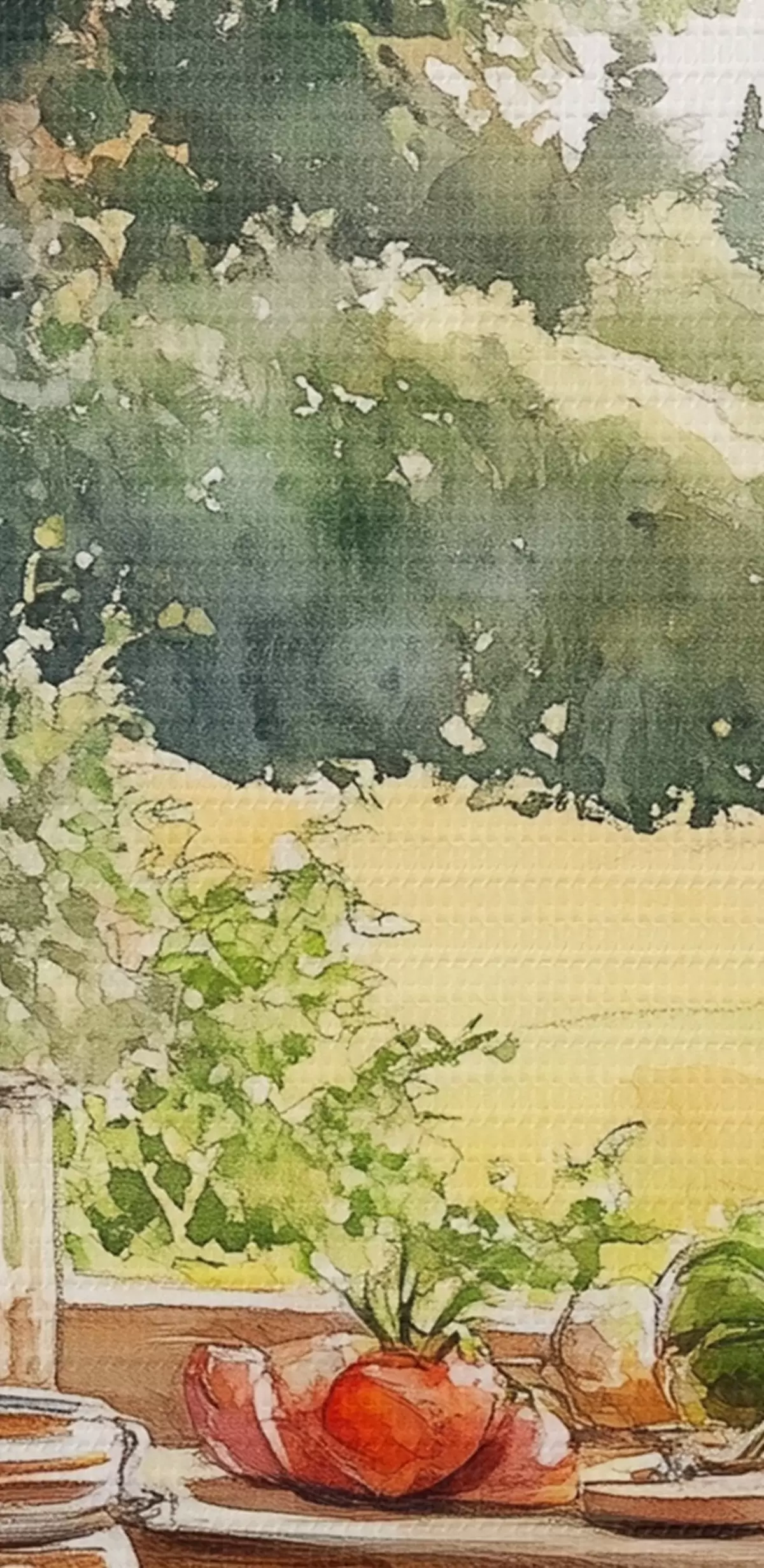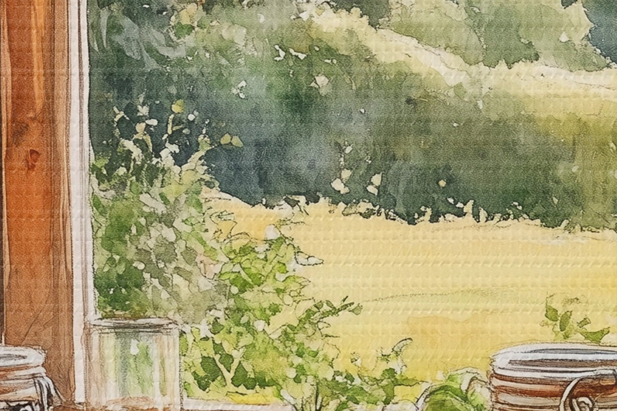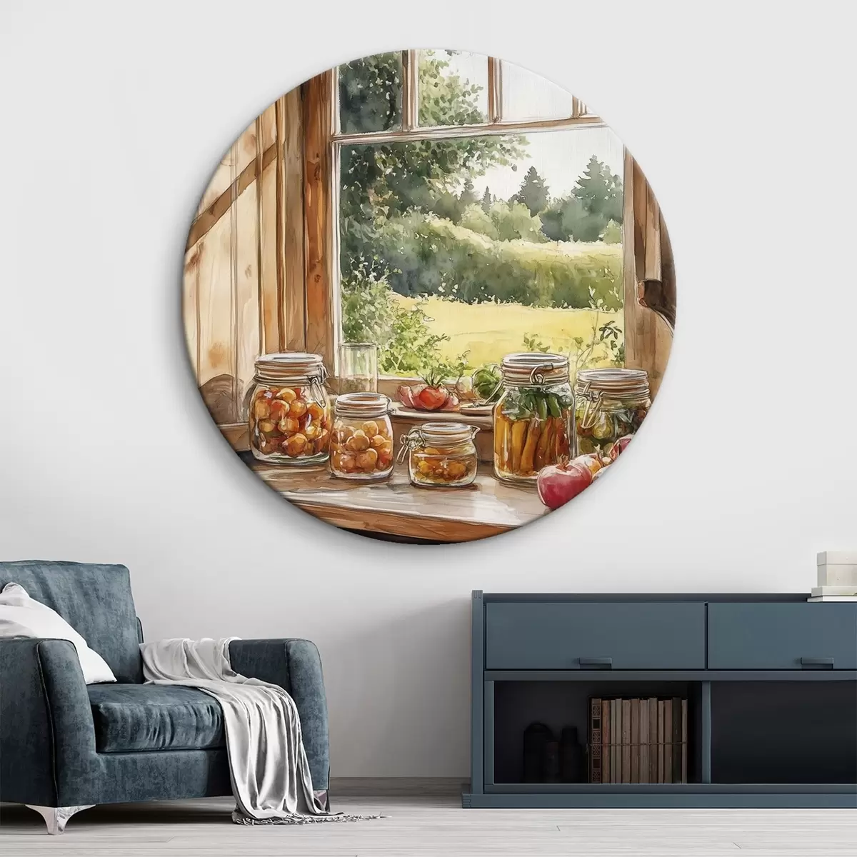 Кругла картина Естетика села, дерев'яний будинок, літня природа, овочі, акварельний стиль Nr r43185