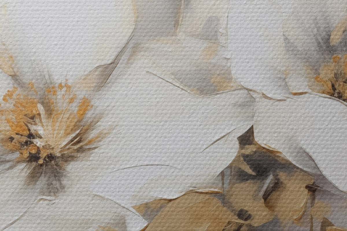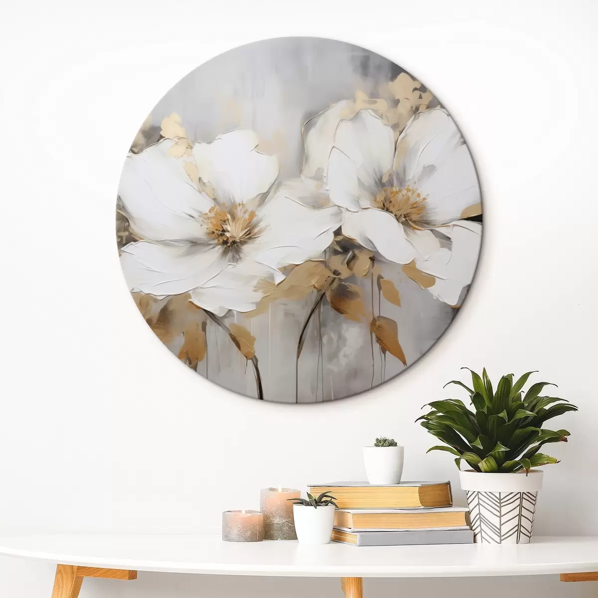 Кругла картина Білі квіти з жовтим листям на білому тлі, імітація густих мазків, фактурний сучасний стиль r43389