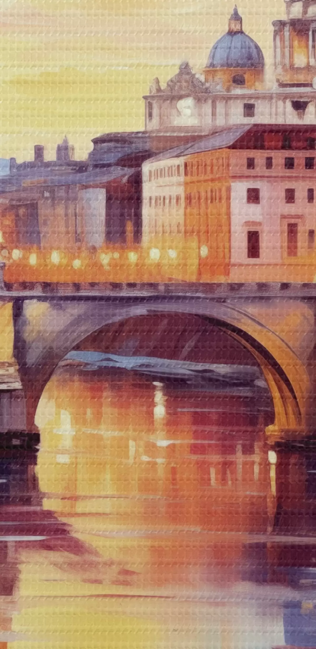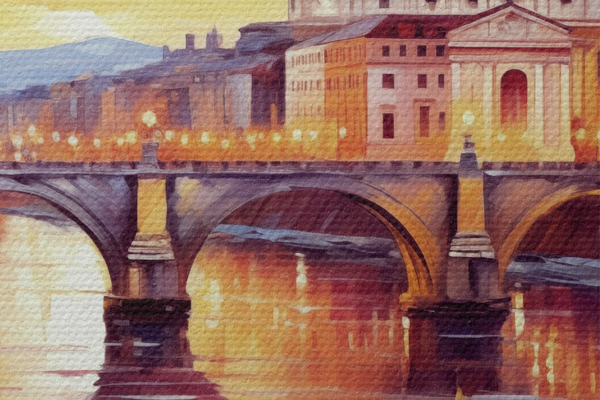 Кругла картина Собор Святого Петра і міст через річку на заході сонця, теплі кольори, відображення у воді, олійний живопис Nr r43396