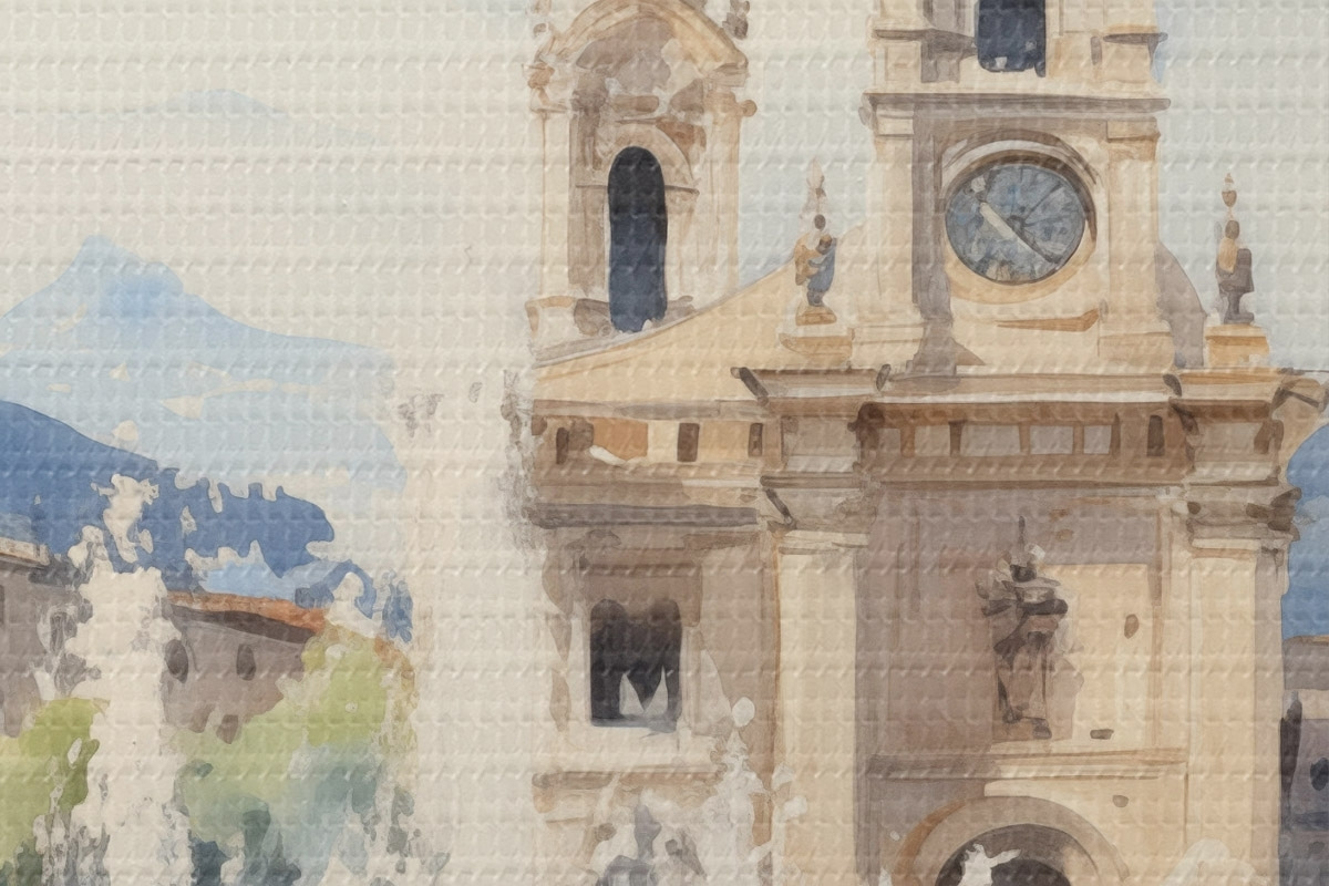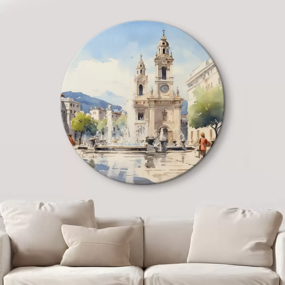 Кругла картина Абстрактний міський пейзаж з вежею та фонтаном на міській площі, гори вдалині, акварельний стиль Nr r43397