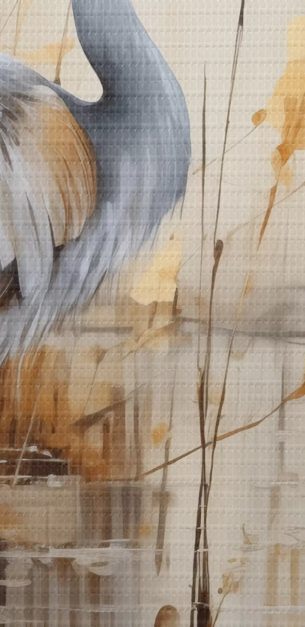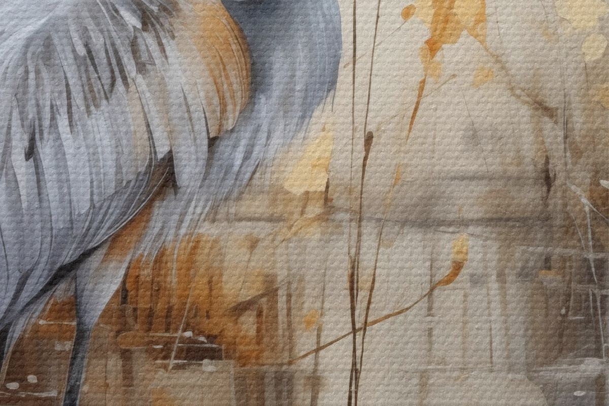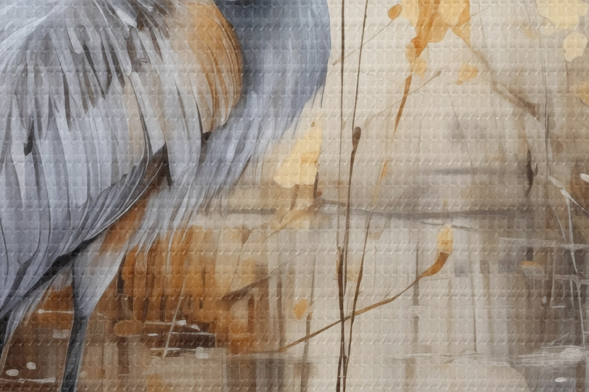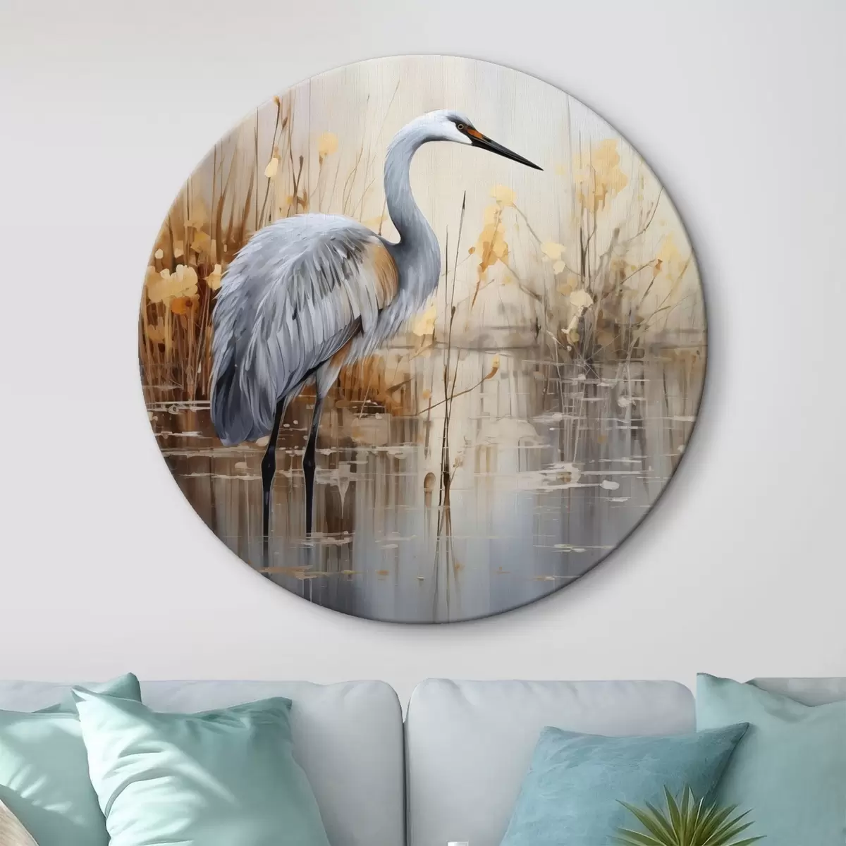 Кругла картина Сіра чапля стоїть у ставку, оточена високими тонкими рослинами, тло - м'яке поєднання бежевого та білого Nr r43398