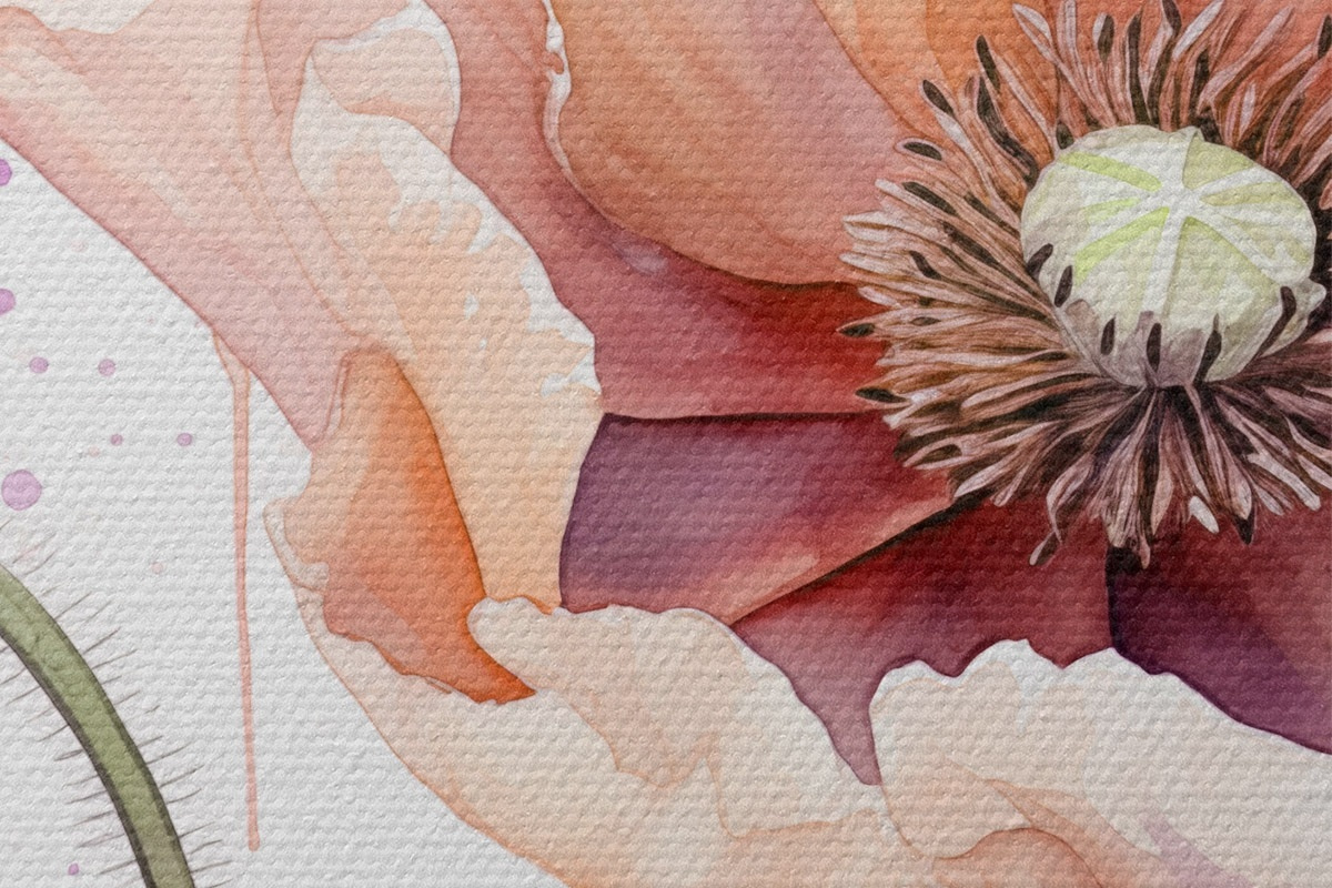 Кругла картина Рожева квітка маку з бутоном на білому тлі, імітація акварельного живопису з патьоками, м'які кольори r43402