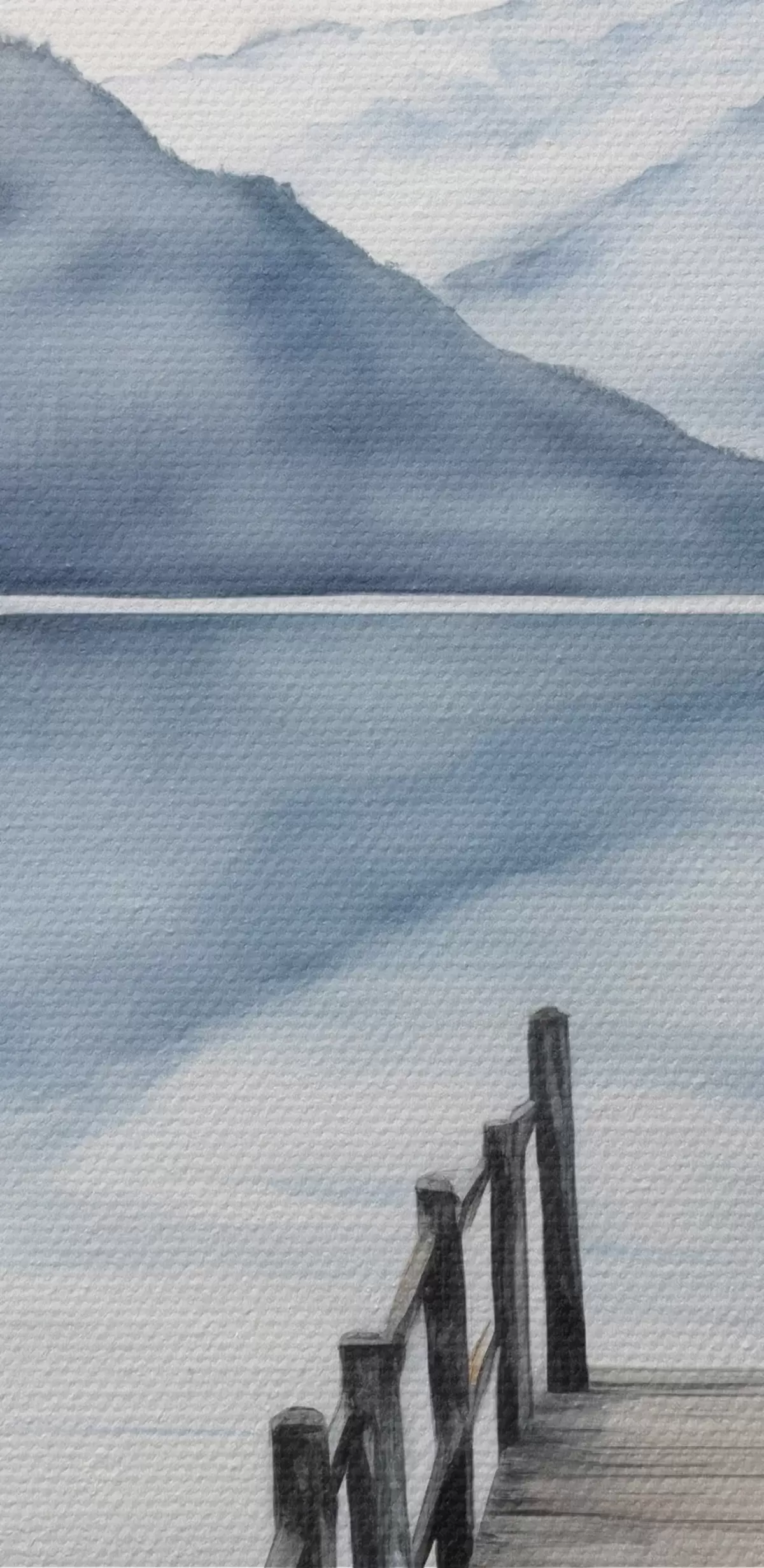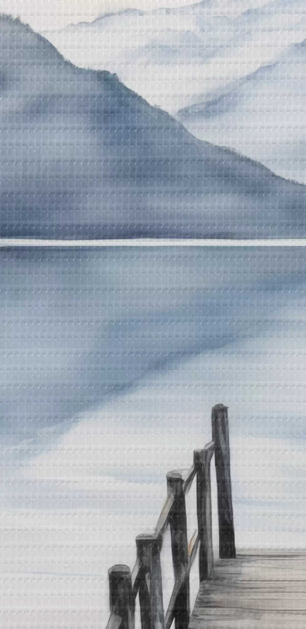 Кругла картина Дерев'яний причал простягається в спокійне озеро, оточене горами і вічнозеленими деревами, в акварельному стилі Nr r43405
