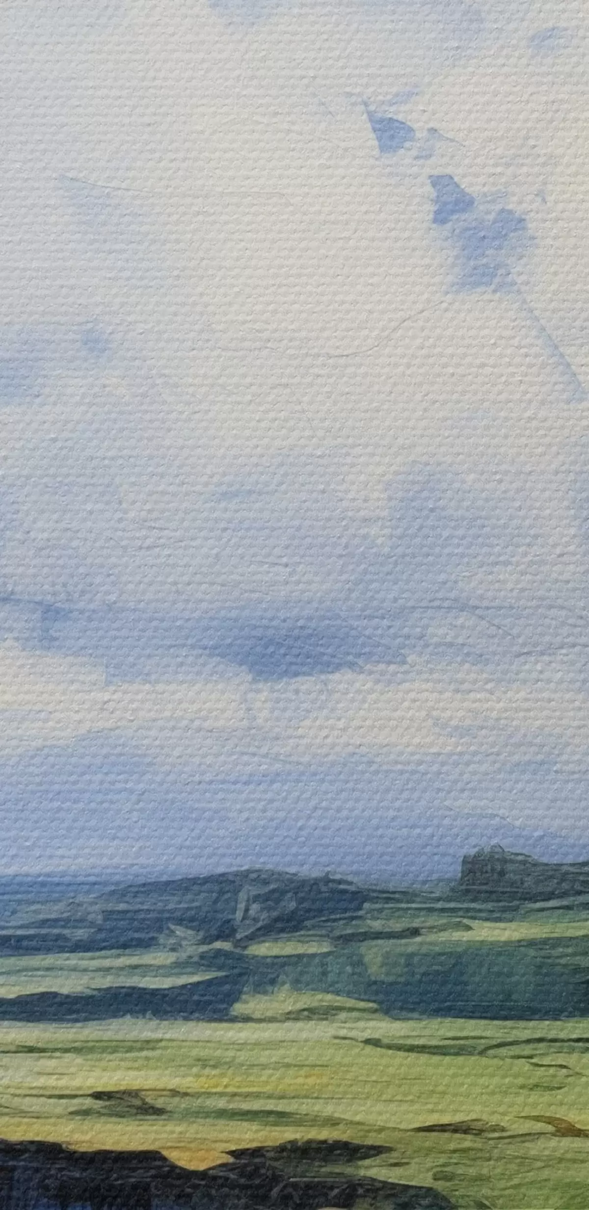 Кругла картина Зелене поле зі скелею на узбережжі, синє море з хвилями, хмарне небо, мінімалістична імітація сучасного олійного живопису r43406