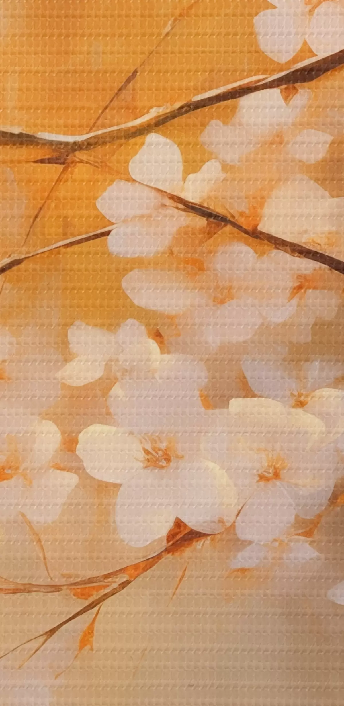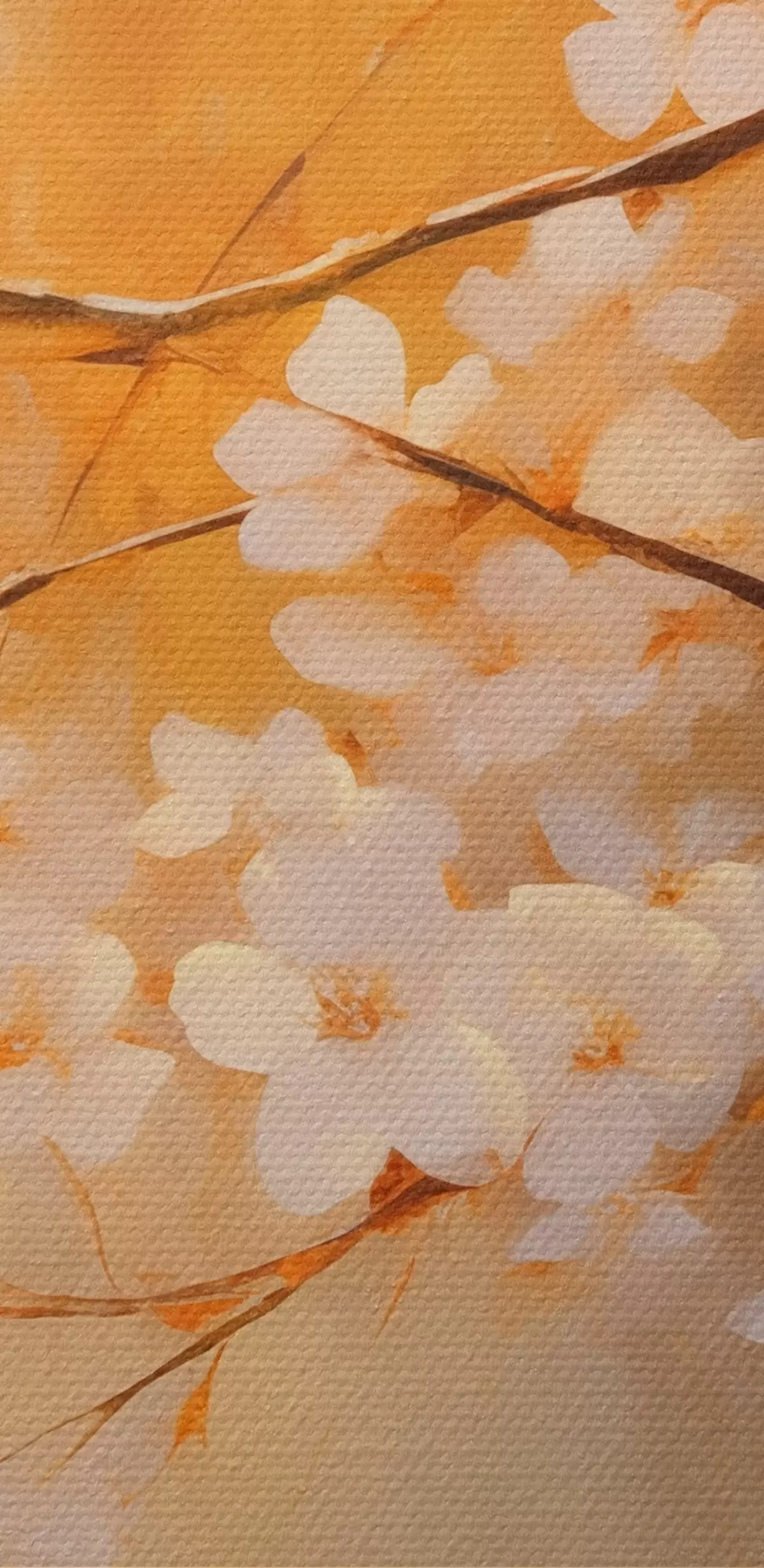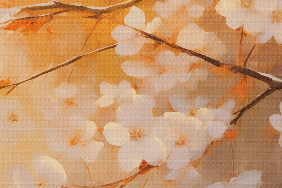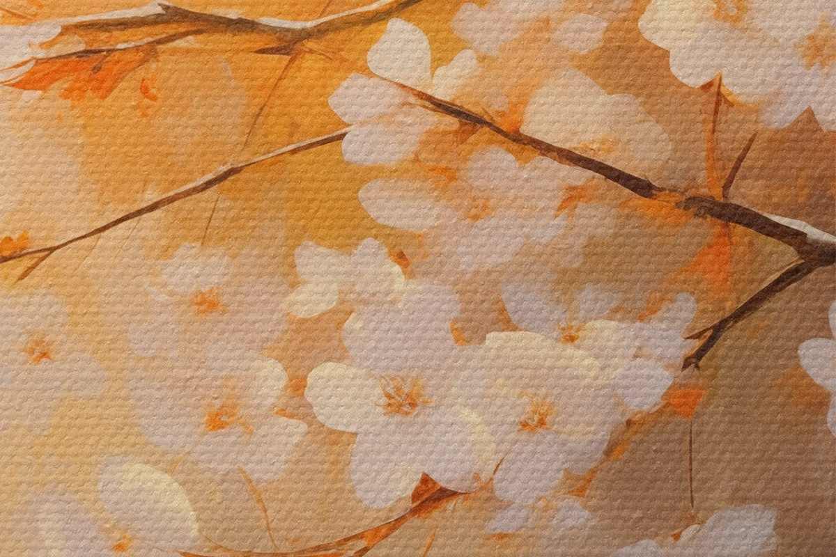 Кругла картина Гілки вишні з помаранчевими квітами, тепла кольорова палітра, на розмитому тлі жовтих відтінків Nr r43407