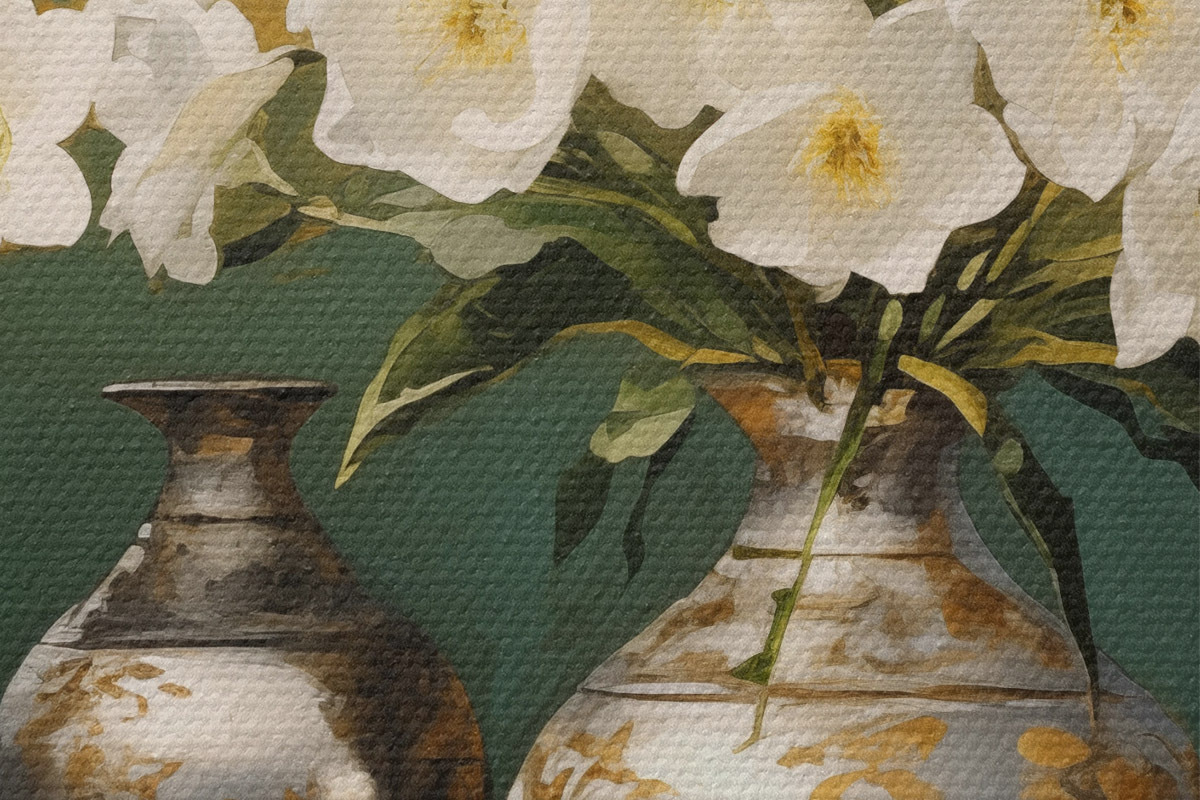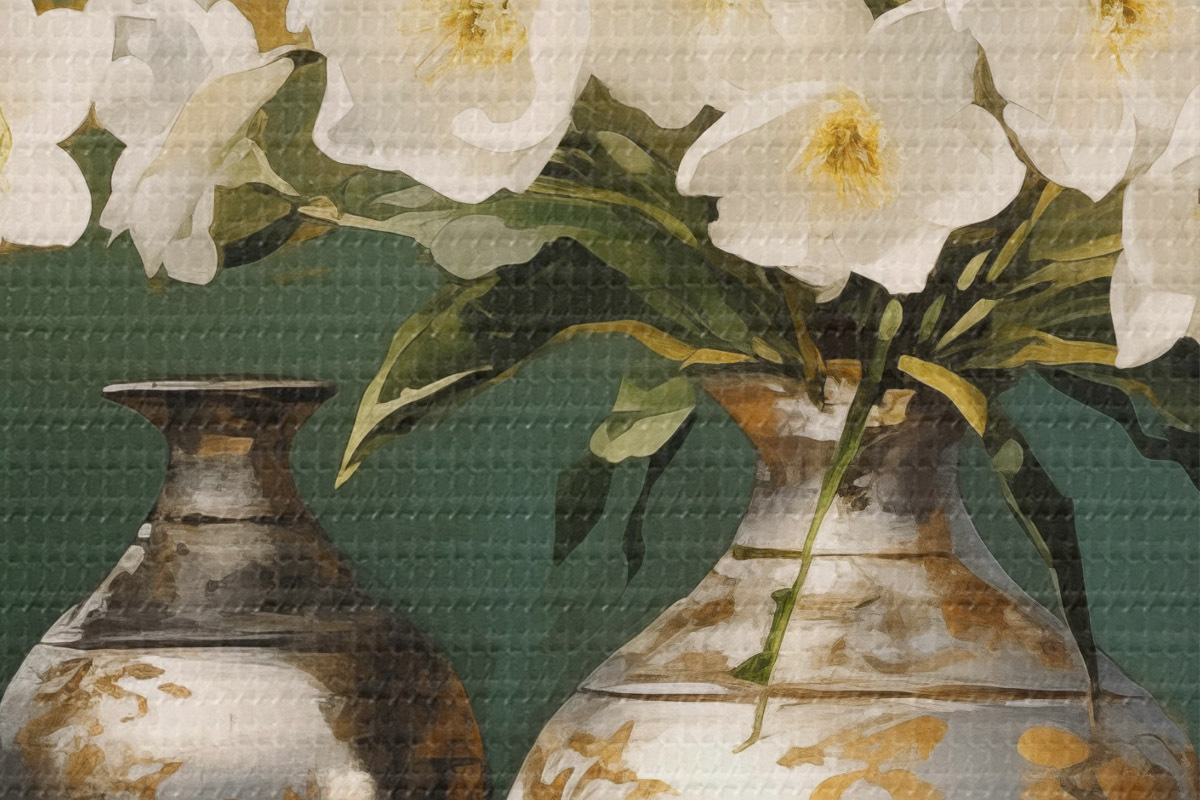 Кругла картина Натюрморт з білими квітами у вазі, з декоративними вазами і мискою на зеленому столі, на темно-зеленому тлі Nr r43408