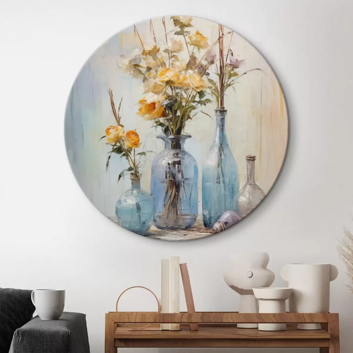 Кругла картина Натюрморт із жовтих троянд у синіх скляних вазах, світле фактурне тло, м'які мазки пензля, олійний живопис r43409