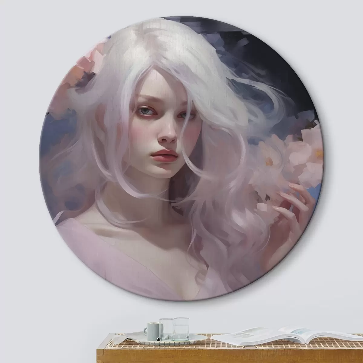 Кругла картина Дівчина з півоніями, акриловий малюнок, темний фон r43496