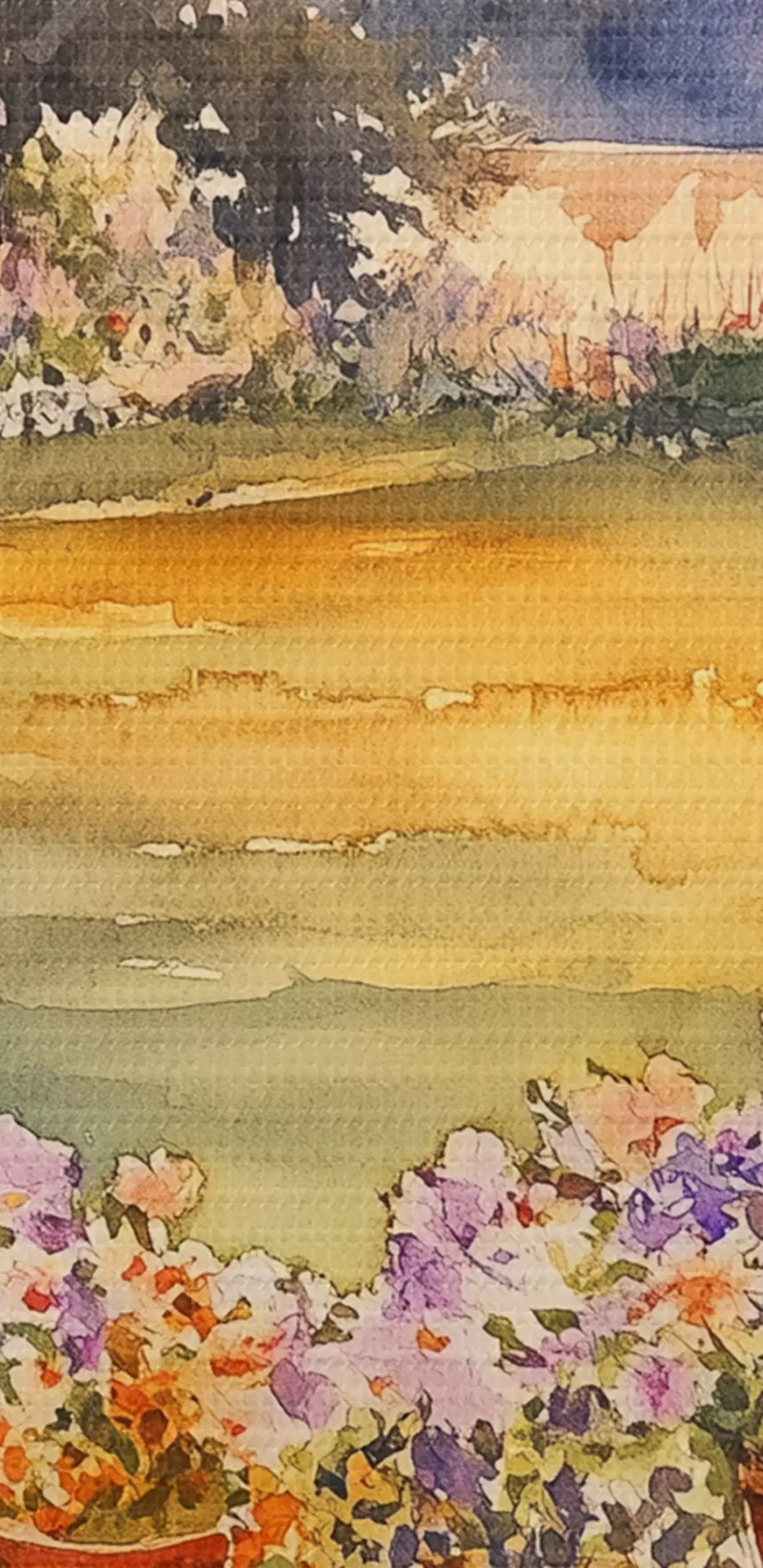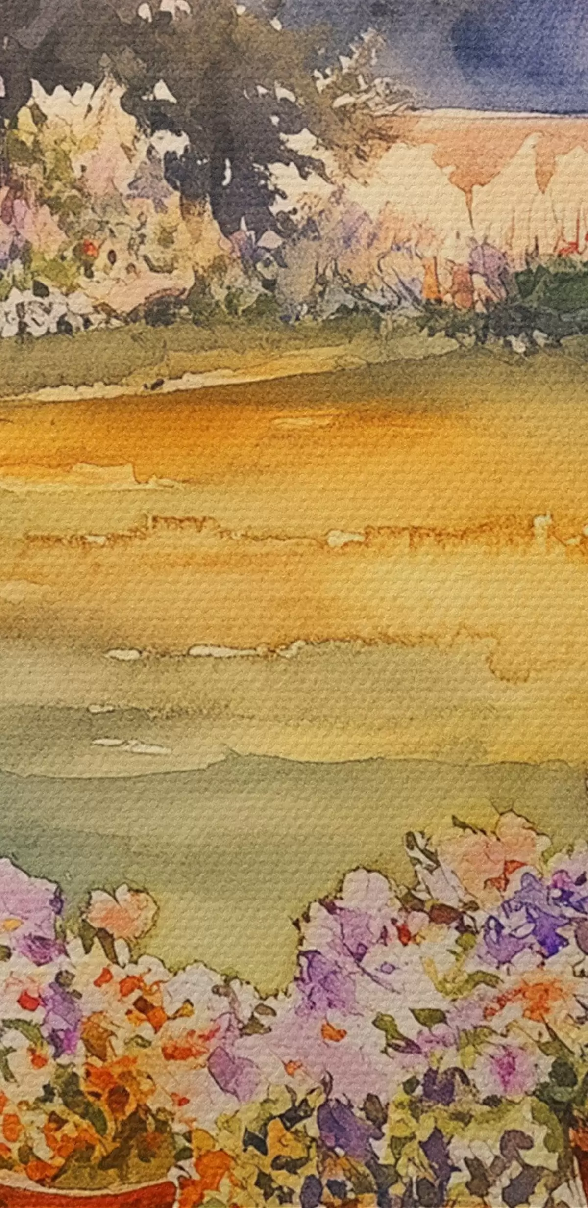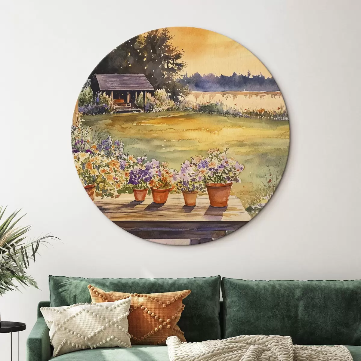 Кругла картина Квіти в сільському саду, кольори заходу сонця, акварельний стиль Nr r44019