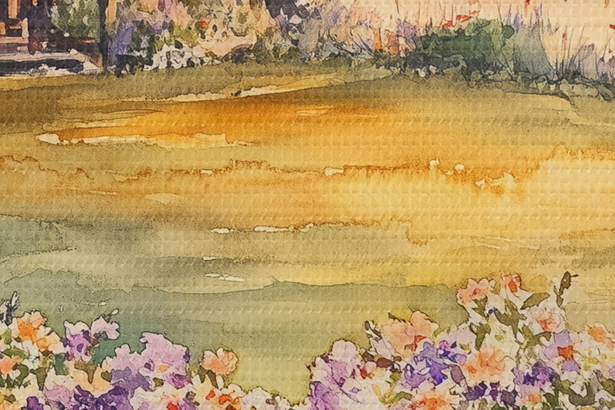 Кругла картина Квіти в сільському саду, кольори заходу сонця, акварельний стиль r44019