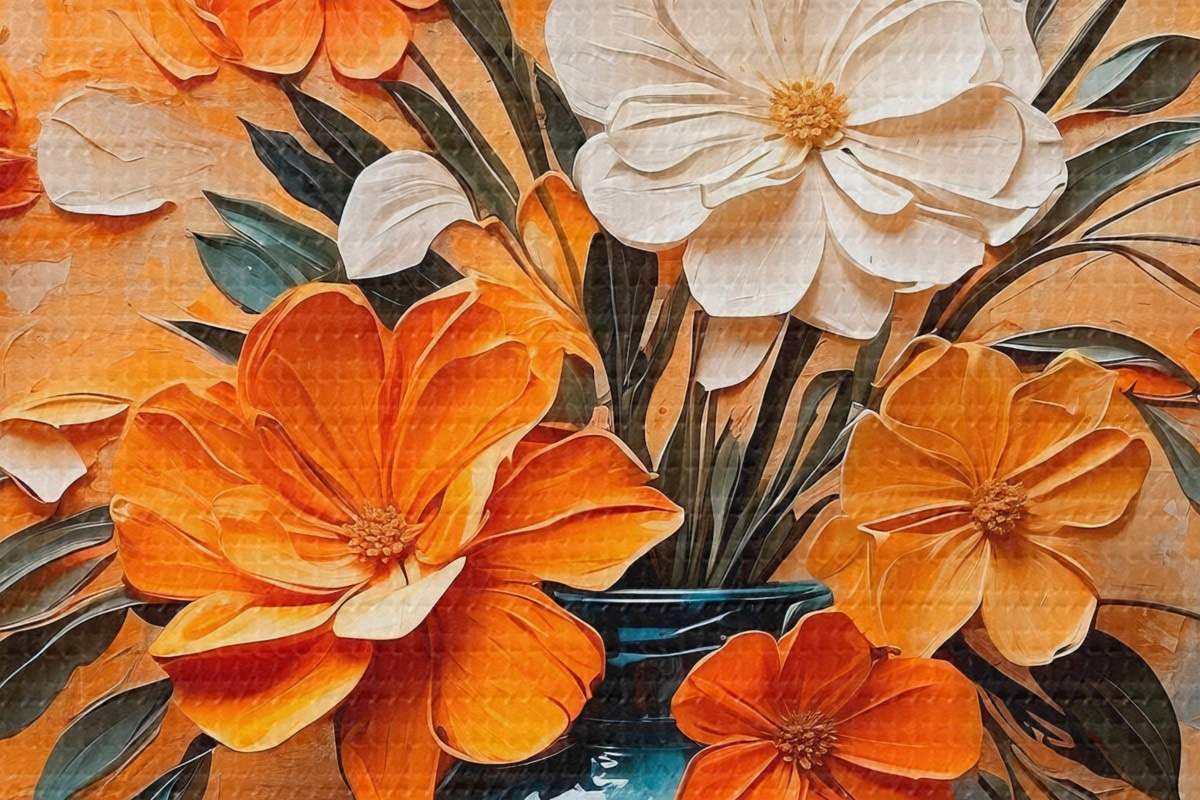 Кругла картина Білі та помаранчеві квіти у вазі в стилі олійного живопису r44059