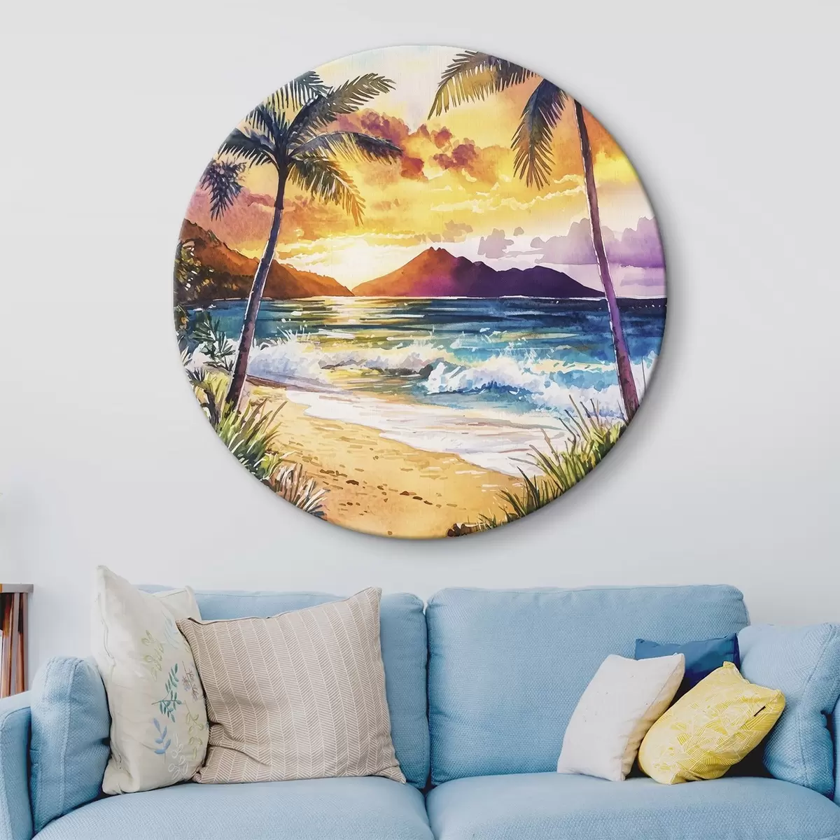 Кругла картина Захід сонця на острові Гаваї, пальми, океан, кольорове небо, акварель Nr r44142