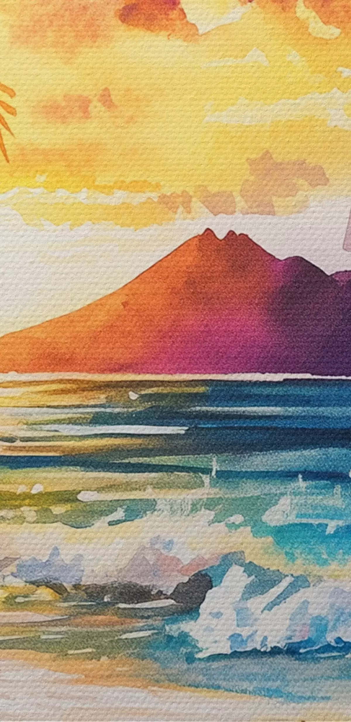 Кругла картина Захід сонця на острові Гаваї, пальми, океан, кольорове небо, акварель r44142