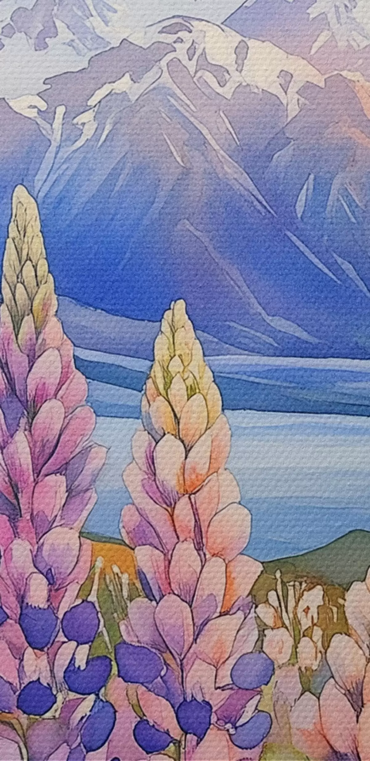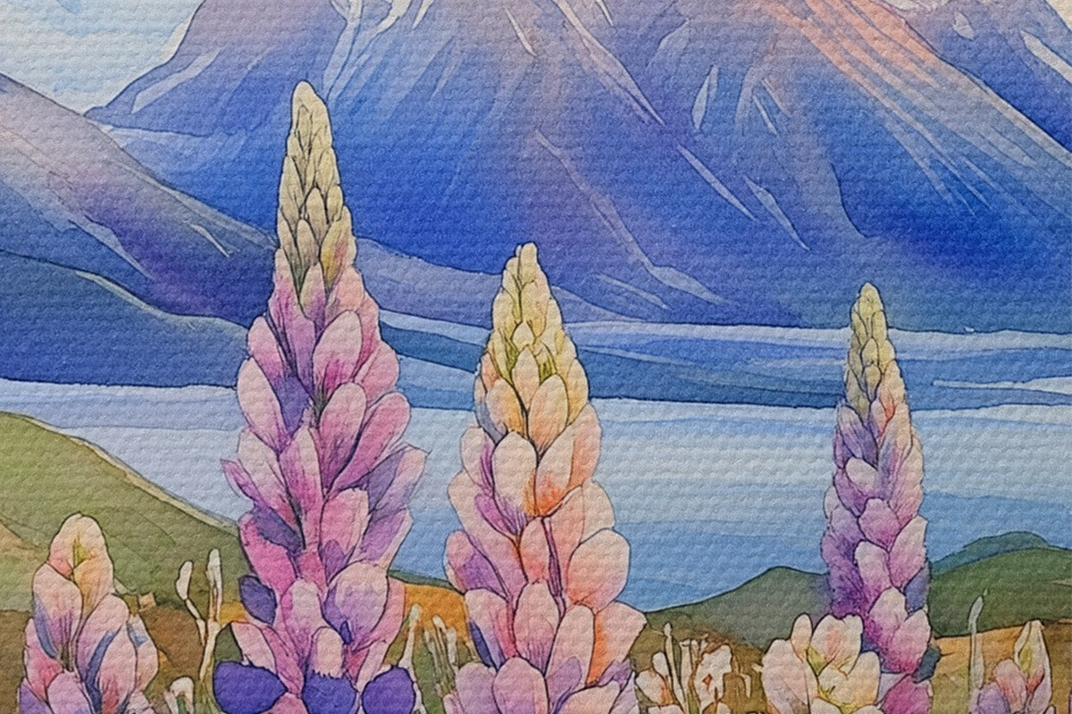 Кругла картина Квіти люпину, луг, гори, акварель, захід сонця, небо r44146