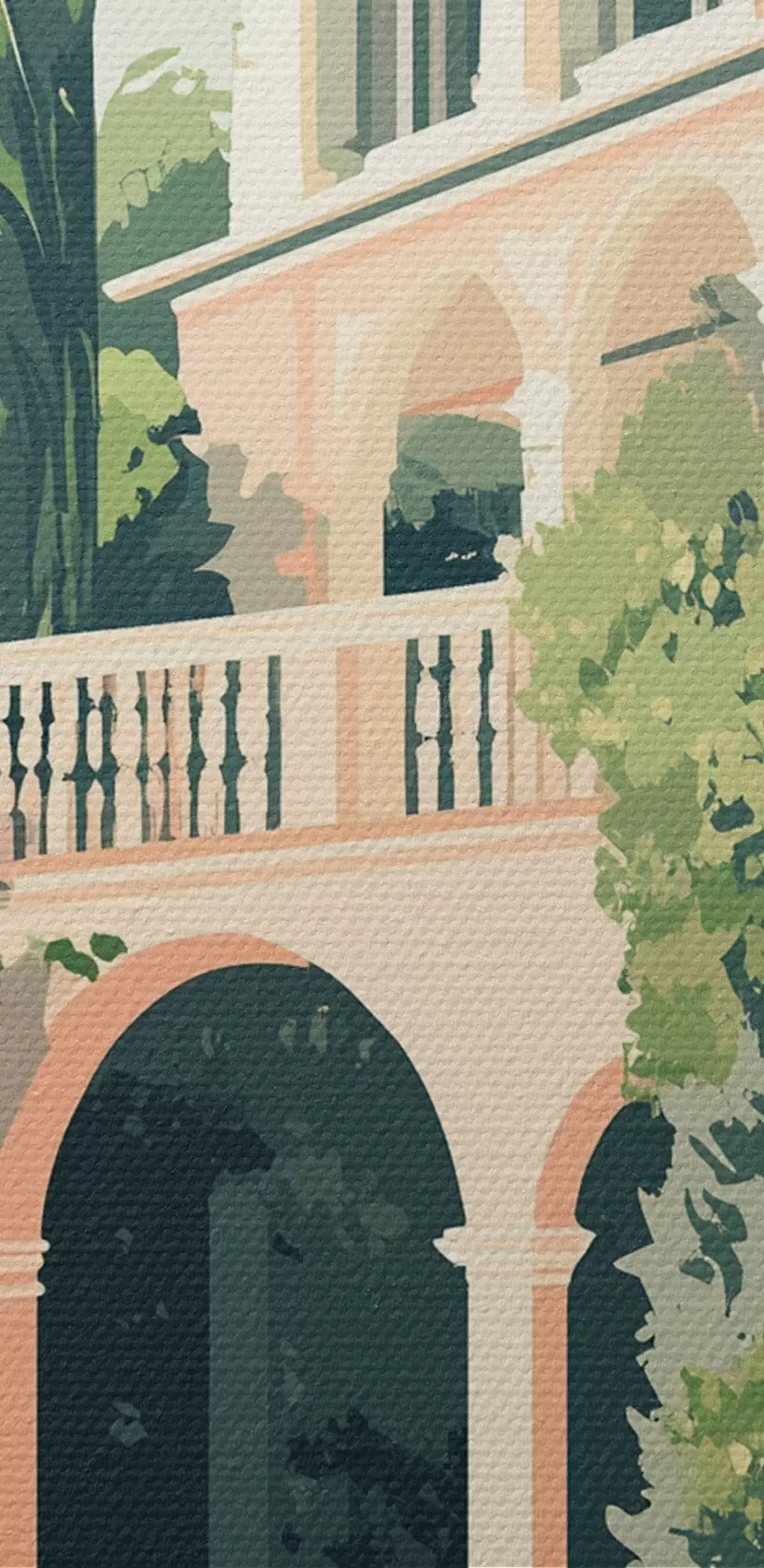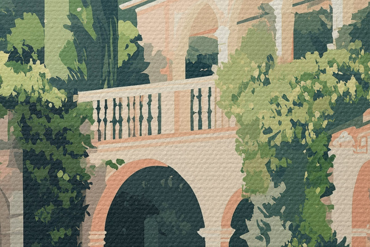 Кругла картина Середземноморська архітектура, тропічна природа, плоский стиль, вілла з садом r44150