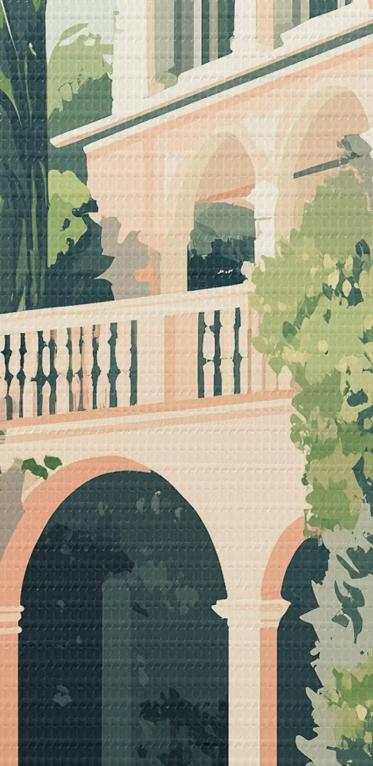 Кругла картина Середземноморська архітектура, тропічна природа, плоский стиль, вілла з садом Nr r44150