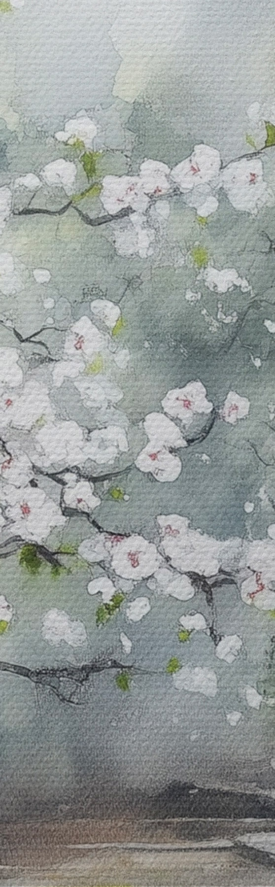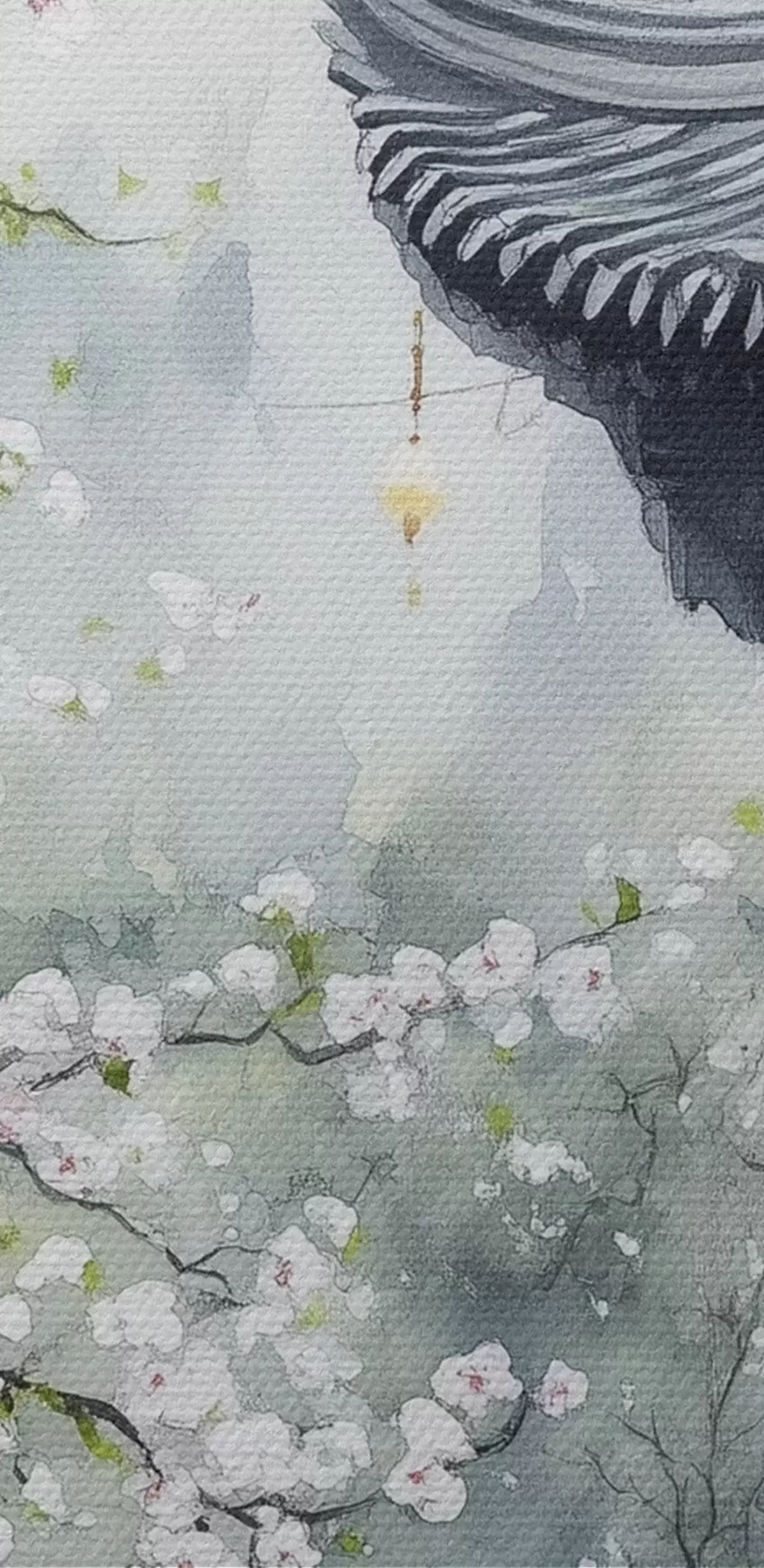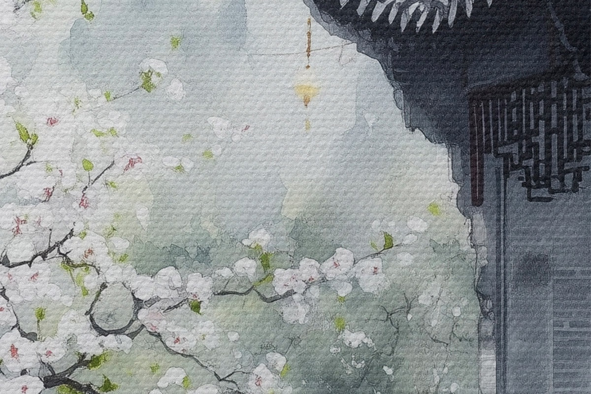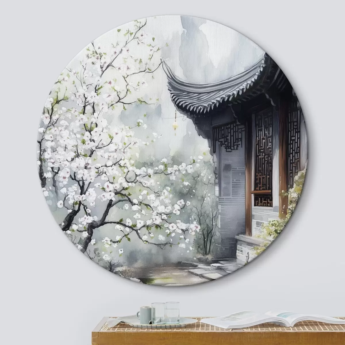 Кругла картина Японський сад з сакурою та будинком, східний, акварельний стиль Nr r44309